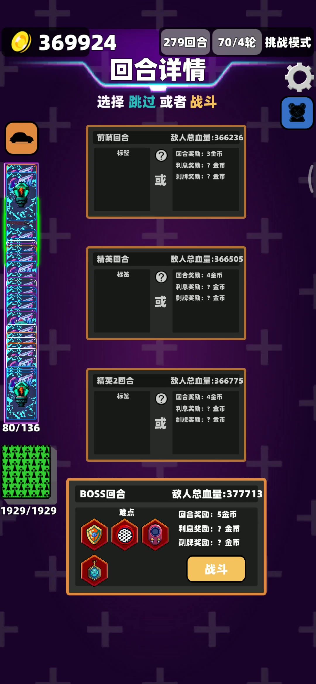 1.装备集齐后商店无法刷新,不但装备,连其他卡包也刷不出来 2.连续快速卖出装备会卡死。卖一个装备必须隔零点几秒再卖下一个,不然死机 3.削卡组1/3不生效,仍然是1/2 4.机器人太bug,战斗还没开始就结束了 5.载具鸡肋,加的那点数值小得可怜,建议百分比 6.某个手牌-1的装备意义不明