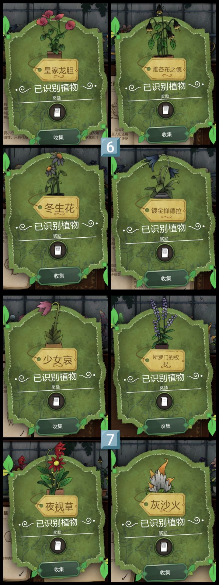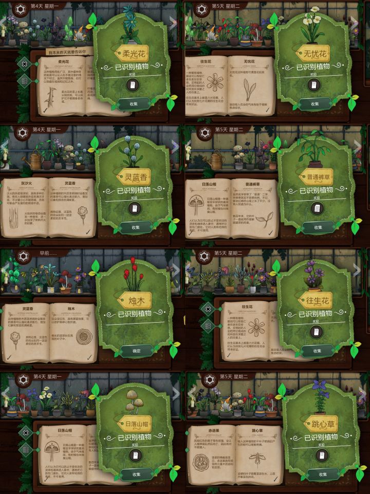 P1:圣约翰红花、柠檬衣、森林樟球、漫游菇、甘迪根、锁心花、狐章花、丑角蓝P2:玛丽之息、壬草、油谷花、娇露草、夏日女士、缘锁草、光肺草、芬尼特P3:柔光花、灵蓝香、烛木、日落山帽、无忧花、普通裤草、往生花、跳心草P4:女巫菲格、赤语果、主教阳伞、冬生花、雅各布之德、镀金惮德拉、皇家龙胆、所罗门的权杖P5:少女哀、夜视草、灰沙火、古翠草、长羞草、加里东铜菇、热吻果、幻心草P6:野芸苔、山