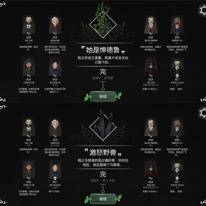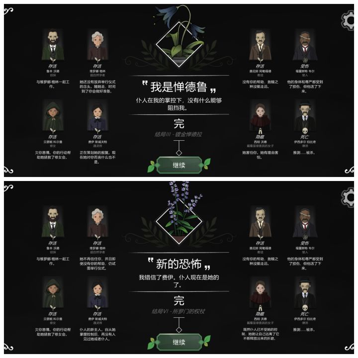 按照第16天的地点来区分结局:🌱【O9】需要五种植物:恶魔睡帽,疾网藤,寡妇哀,长羞草,古翠草📍第15天给【寡妇哀】→【结局1】:思曲(血肉横飞)📍第15天给【死人手指】→【结局2】:古翠草(沉睡的惮德鲁)🧪【A25】女儿巨石圆阵前置:第13天给图书馆员【海神之瓣】得到【控制药剂】配方:所罗门权杖➕女巫菲格➕农夫愁】📍第15天给面具女【寡妇哀】→第16天先用【疾网藤】再喝药剂→【结局
