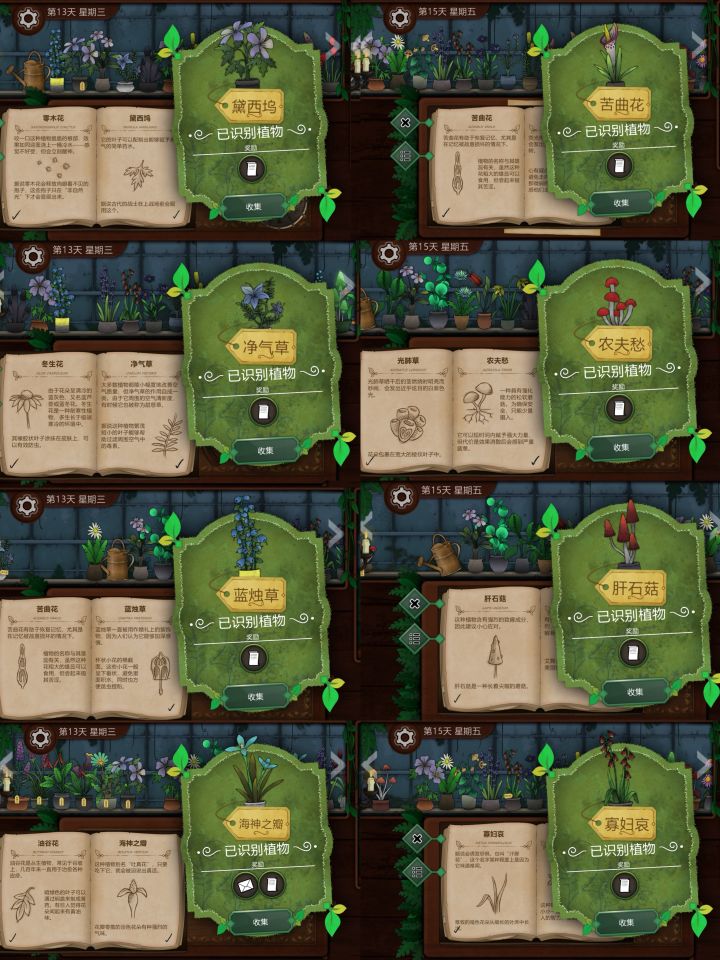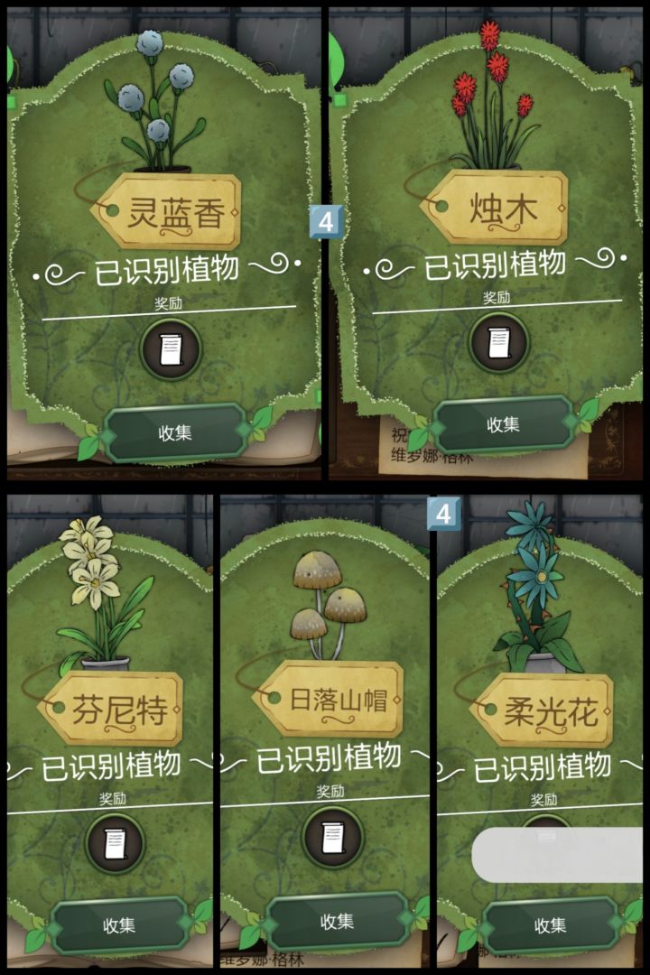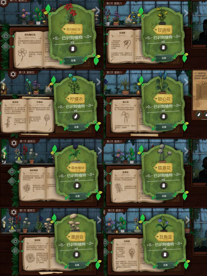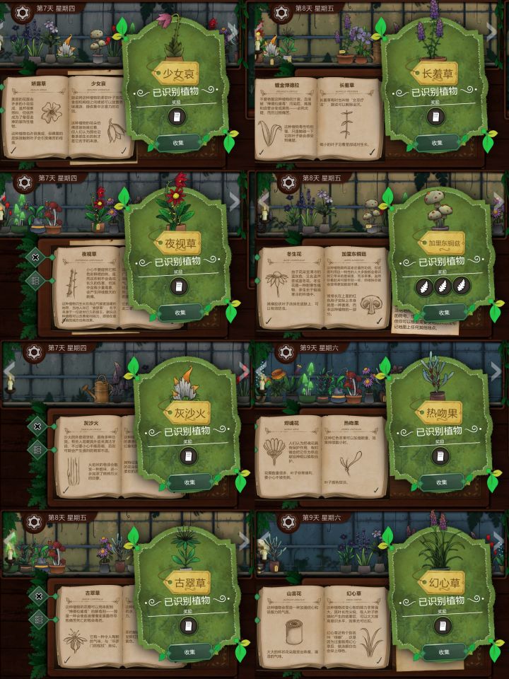 P1:圣约翰红花、柠檬衣、森林樟球、漫游菇、甘迪根、锁心花、狐章花、丑角蓝P2:玛丽之息、壬草、油谷花、娇露草、夏日女士、缘锁草、光肺草、芬尼特P3:柔光花、灵蓝香、烛木、日落山帽、无忧花、普通裤草、往生花、跳心草P4:女巫菲格、赤语果、主教阳伞、冬生花、雅各布之德、镀金惮德拉、皇家龙胆、所罗门的权杖P5:少女哀、夜视草、灰沙火、古翠草、长羞草、加里东铜菇、热吻果、幻心草P6:野芸苔、山