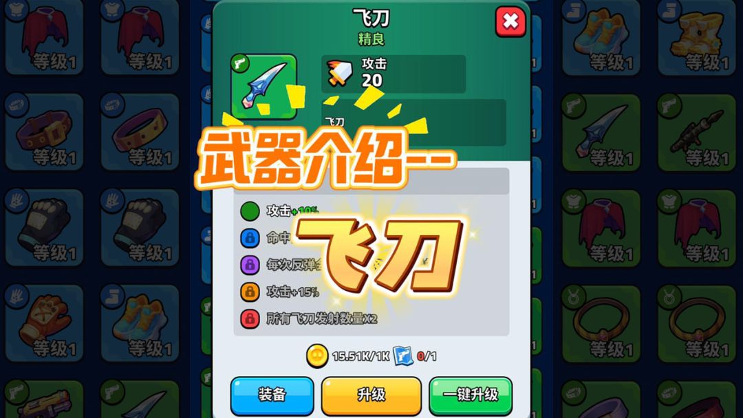 默认初始主武器:格洛克 其他装备:初期可随意搭配,等获取更好的装备后,可通过装备降级返还升级图纸和金币。 第一关游戏时长:5分钟 第一关相对容易,可通过走位拾取经验,快速选择技能并提升伤害值。 技巧1 每局有一次机会通过看广告提升技能,可根据自身需求选择是否使用。推荐保命技能【导电哨卫】和【磁悬浮防御盾】;若想提升伤害,可选择无人机A和无人机B。 技巧2 如果技能选择不当,可通过躲避坚持3分钟