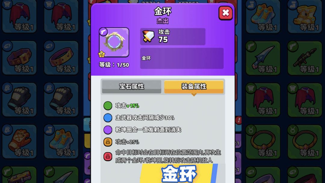 S武器:金环 品质技能 绿色:攻击+15% 蓝色:主武器攻击间隔减少30% 紫色:乾坤圈会一直发射直到消失 橙色:攻击+25% 红色:命中目标时会在目标所在位置范围内,再次生成两个金环/乾坤圈,旋转后攻击随机敌人 超武(新技能):进化为乾坤圈,生成的乾坤圈会向敌人发射3枚金环后再飞向敌人造成伤害。 超武合成条件 5星金环+1星高爆火药合成变为【乾坤圈】 #发现好游戏 #绝境突击者 #游戏日常 #割