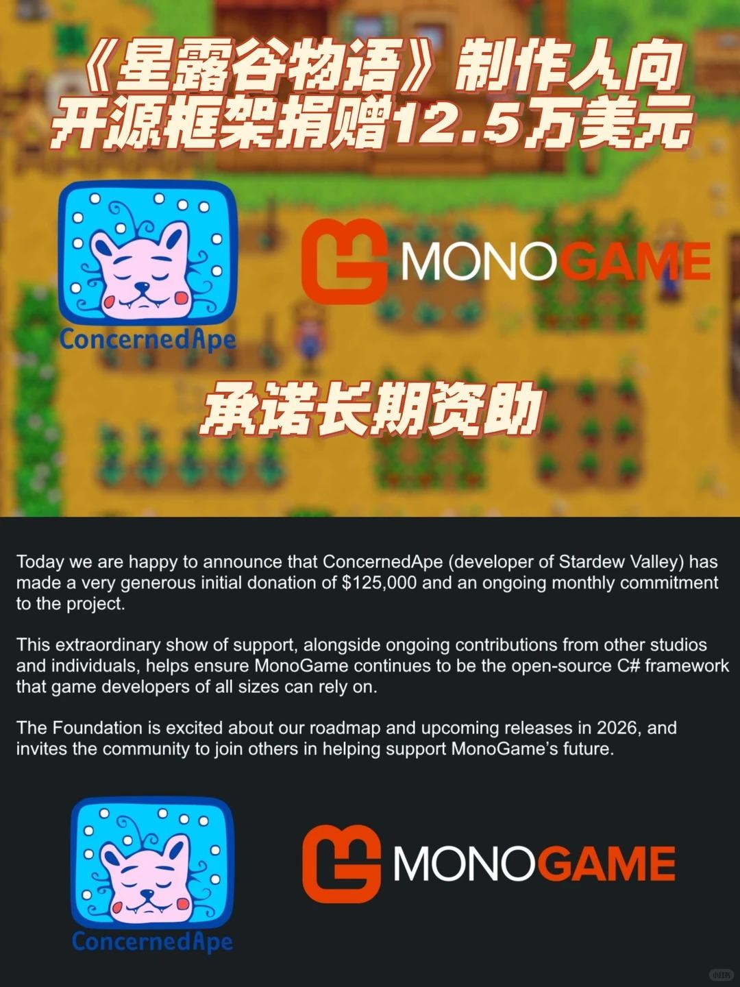 《星露谷物语》制作人埃里克·巴隆,正助力确保游戏开发者能持续使用他多年依赖的开发资源。他不仅向关键开源软件提供大额捐赠,更承诺成为长期定期资助者。MonoGame作为一款C#开源框架,旨在简化游戏开发流程,已被数百名开发者(含多位知名制作人,巴隆即其中之一)采用。MonoGame在X声明中表示:"今日我们欣喜宣布,ConcernedApe已慷慨捐赠12.5万美元启动资金,并承诺长期月度资助。此非