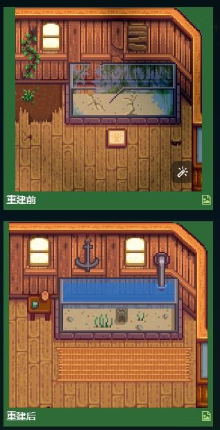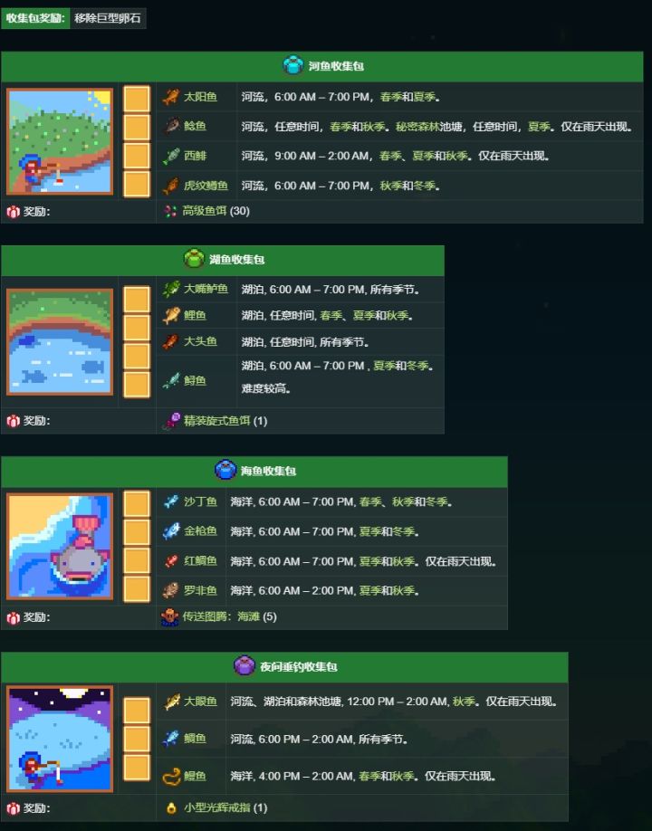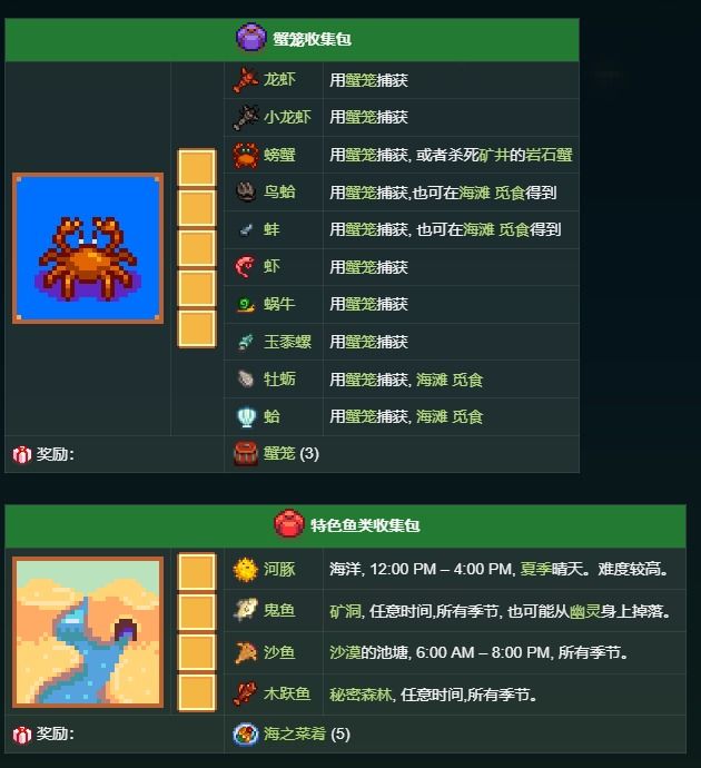 🐟 鱼缸:从简陋到精致的渔业殿堂 🐟当你完成首个收集包,鱼缸便会华丽登场!瞬间从 “破旧池塘” 变身 “专业水族馆”。这里的收集包不仅考验钓鱼技巧,还能解锁矿井旁的巨型卵石移除和威利的淘盘奖励!🎣 收集包全解析:河湖海夜钓 + 蟹笼大挑战🌊 河鱼收集包鱼种:太阳鱼(河流,6AM-7PM,春 / 夏)鲶鱼(河流,任意时间,春 / 秋;秘密森林池塘,任意时间,夏,雨天)西鲱(河流,9PM-