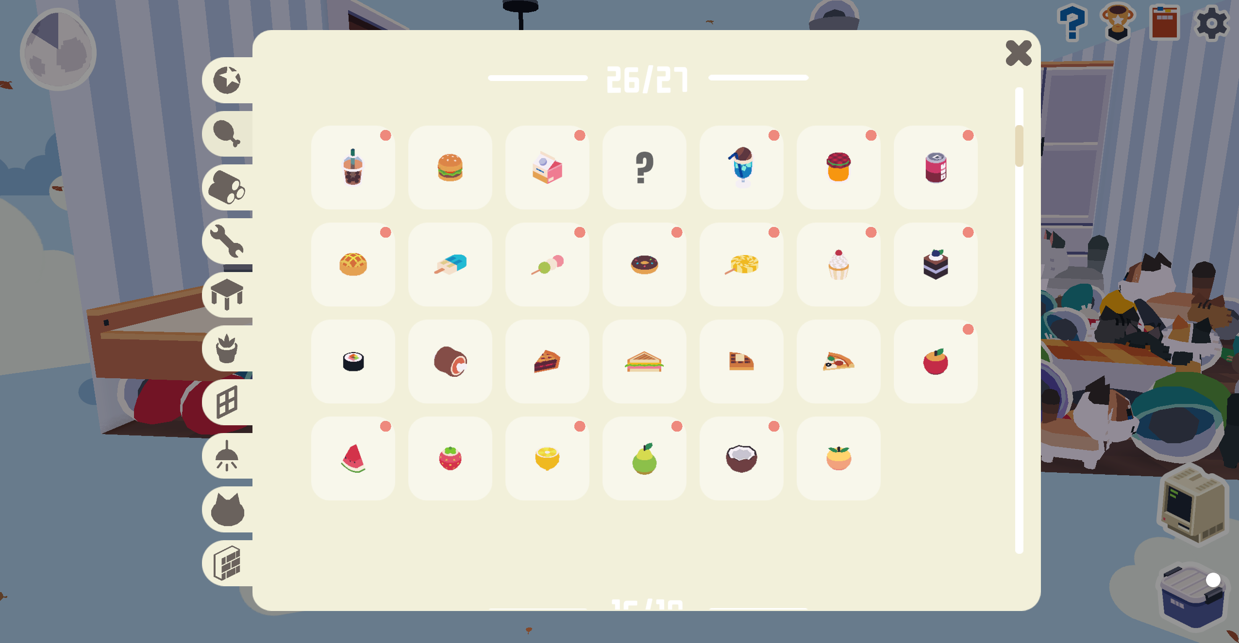 收纳袋可以收起来一切非家具。至于从扭蛋里开出来的家具,它们会自己刷新吸附到房间的墙壁和天花板上。软盘里有装家具的合成配方。可以在合成箱里合成家具。这么多的食物,要是能一键收回冰箱里就好了。
