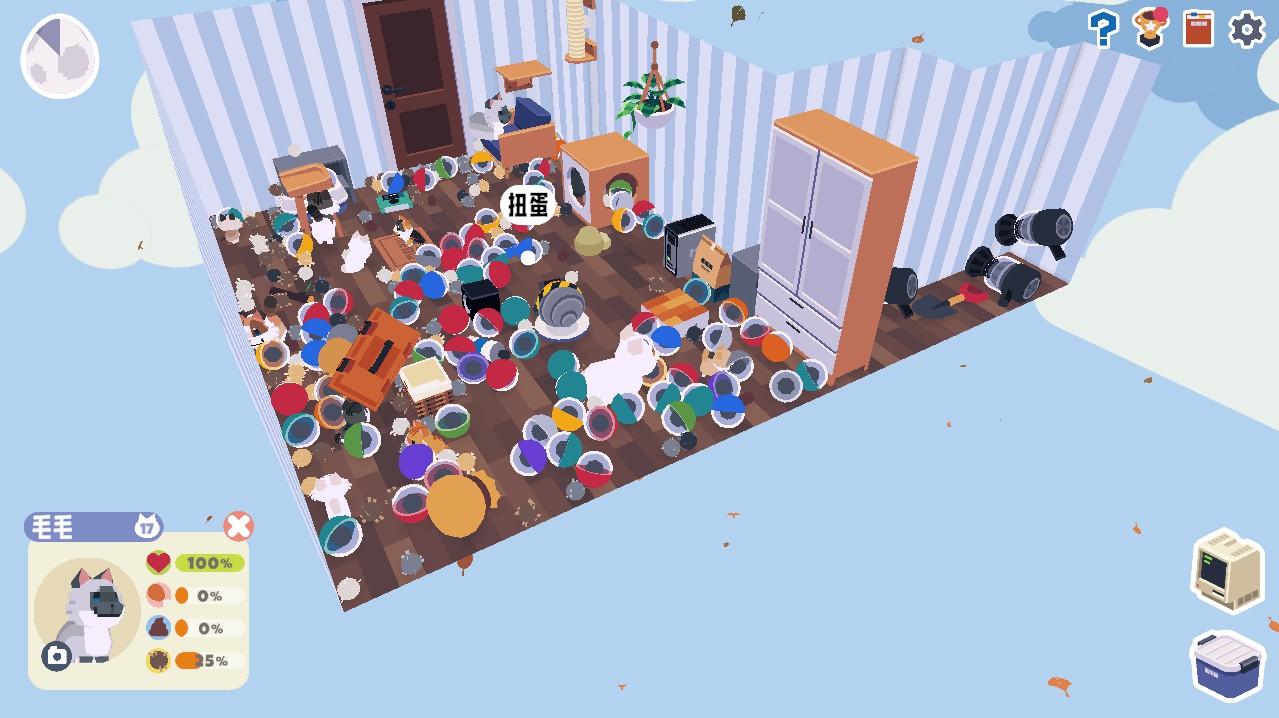 蛋可以孵化出小猫。清理小猫的便便和毛球可以累计获得新蛋的进度。猫猫的毛色有47种之多。猫猫的名字可以随机也可以自由取。拉屎的频率比吐毛球的频率低。猫猫平时不常拉屎,很省心。清理便便也可以增加新蛋进度。用棕色地板的话,便便都看不太到,隐藏在地板里了。猫猫被砸到会很惊讶哦。如果用食物砸猫猫,猫就会去吃砸到眼前的食物。猫猫有时候会对着墙或者家具走。有次看到一个笨猫被碗给困住了。猫猫能蹦好高哦,墙上有个猫爬架,真的就蹦上去了。而且小猫特别好,会帮我跳起来扑扭蛋。如果挂机很久的话,会得到满地的扭蛋和毛球。能快速拿蛋和得到一大堆的家具。满地的扭蛋从房子底部的视角往上看就好像满地的海洋球一样。