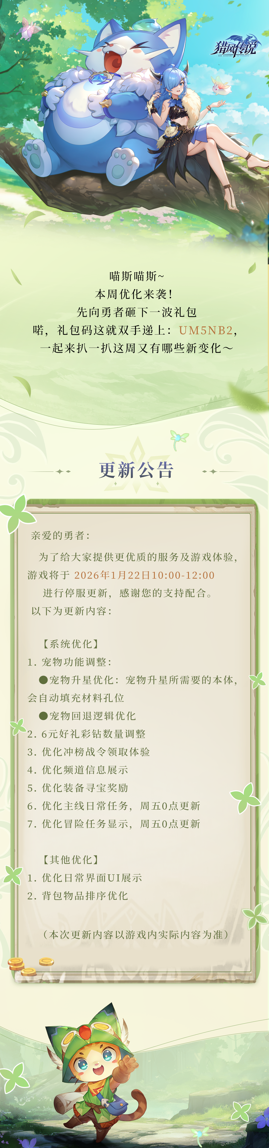 喵斯喵斯~本周优化来袭!先向勇者砸下一波礼包 喏,礼包码这就双手递上:UM5NB2,一起来扒一扒这周又有哪些新变化~