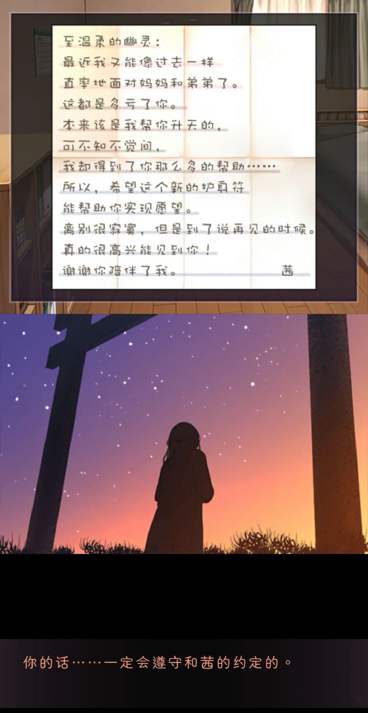 很温馨美好的游戏,共8关两个结局。以主人公茜的视角出发,她和妈妈、弟弟枫真相依为命。有一天茜在神社门前遇到了一个幽灵,他会开导、鼓励自己。为了让幽灵“升天”,有个好的归宿,她帮助幽灵找护身符,送他龙胆花,给他水果,帮他求来恶灵退散符咒,为他制作新的护身符。在一次找妈妈的时候,茜看到了妈妈的日记,知道了妈妈的苦楚,一个人要辛勤地工作,还要照顾两个孩子,难过时也只能找安静的地方放空自己,无人诉说,无