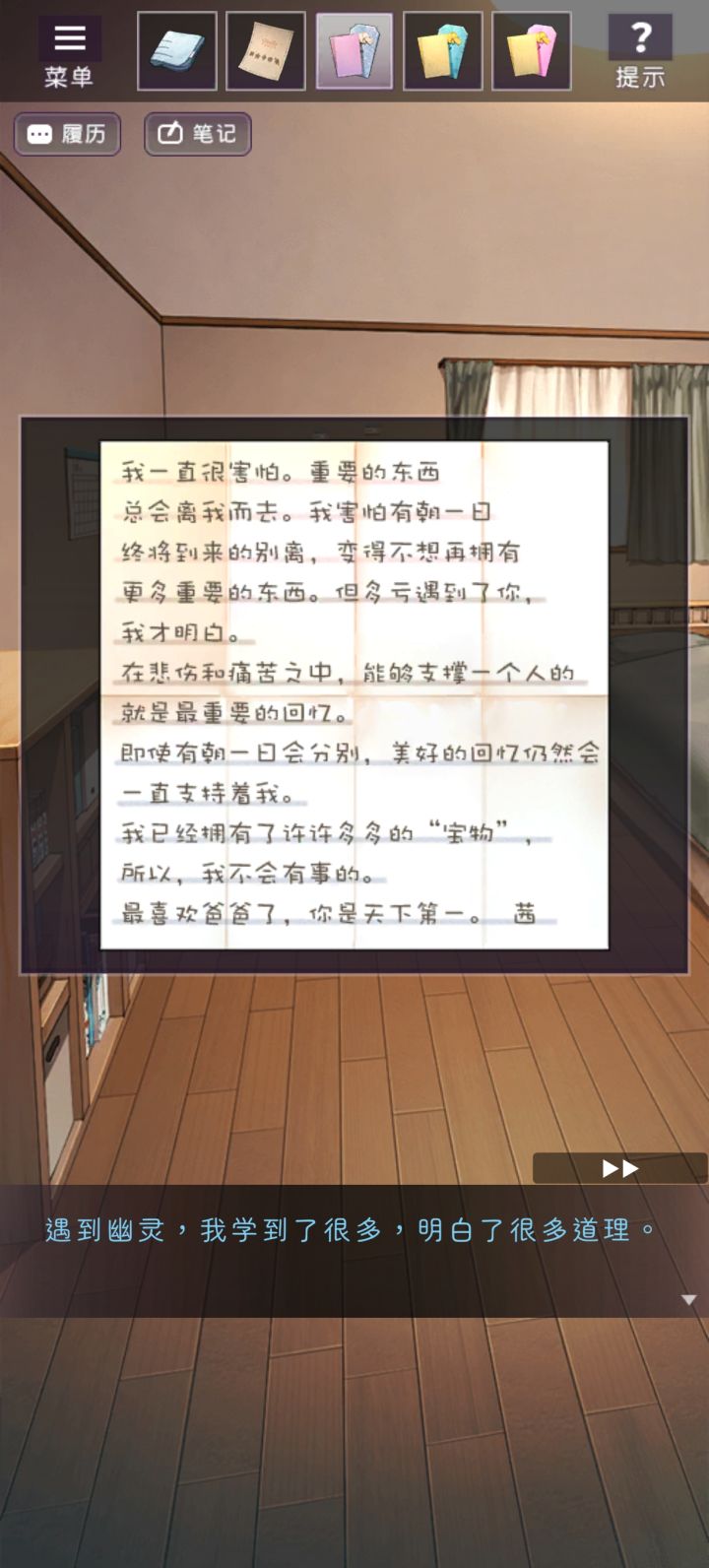 幽灵给了蓝色护身符后找妈妈对话,妈妈给了粉色护身符,去水镜占卜写彼岸花,把这张纸两次放到水里,纸上的符号变色对应蓝色和粉色的护身符(别忘拿钥匙,去拿折纸),回到家把护身符折好,输入“宝物别忘记”,达成真结局