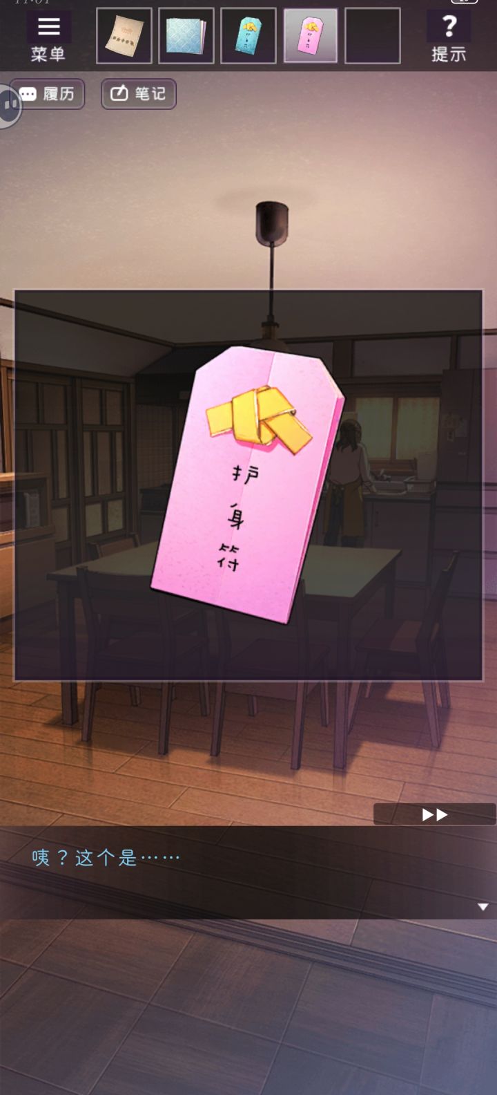 幽灵给了蓝色护身符后找妈妈对话,妈妈给了粉色护身符,去水镜占卜写彼岸花,把这张纸两次放到水里,纸上的符号变色对应蓝色和粉色的护身符(别忘拿钥匙,去拿折纸),回到家把护身符折好,输入“宝物别忘记”,达成真结局