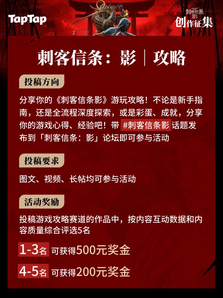 《刺客信条:影》已经发售,各位刺客大师准备好续写刺客传奇了吗?投稿参与创作征集活动,更有机会获得现金奖励哦!活动时间:2025年3月19日-2025年4月20日🔥投稿方向一:《刺客信条:影》游戏评测围绕《刺客信条:影》进行游戏评测~带话题#刺客信条影 发布游戏评测至《刺客信条:影》论坛,分享你的观点即可参与活动🔥投稿方向二:《刺客信条:影》游戏攻略围绕《刺客信条:影》进行攻略输出吧!带