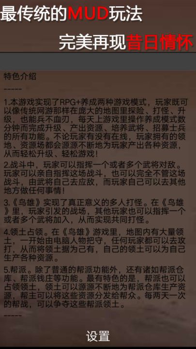 有人的地方就有江湖,与以往单机MUD游戏乏味无趣不同的是,本游戏可容纳万千玩家同服游玩。...