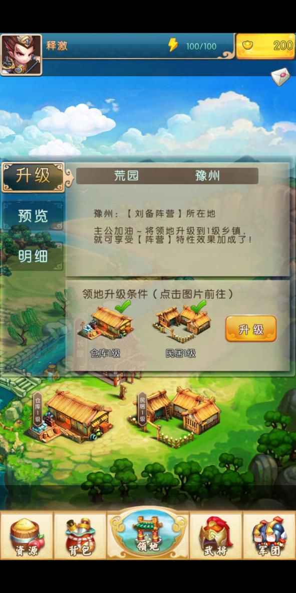 作为一个策略经营游戏,发展是硬道理。《小小三国2》自然离不开建设。一位不知名的著名军师曾说过:“一切没有经济资源作为后盾的战争都是耍流氓。”接下来我们就一起来看下游戏中的领地建设。游戏中的领地发展围绕建设和生产展开,点击村长屋可以找到领地所属阵营、升级条件、状态及基本情况。小编在这里教大家一套方法前期升级建筑跟着主线任务的路线,基本能升到四级乡镇;之后在资源界面根据自己的升级建筑的需求来调整工