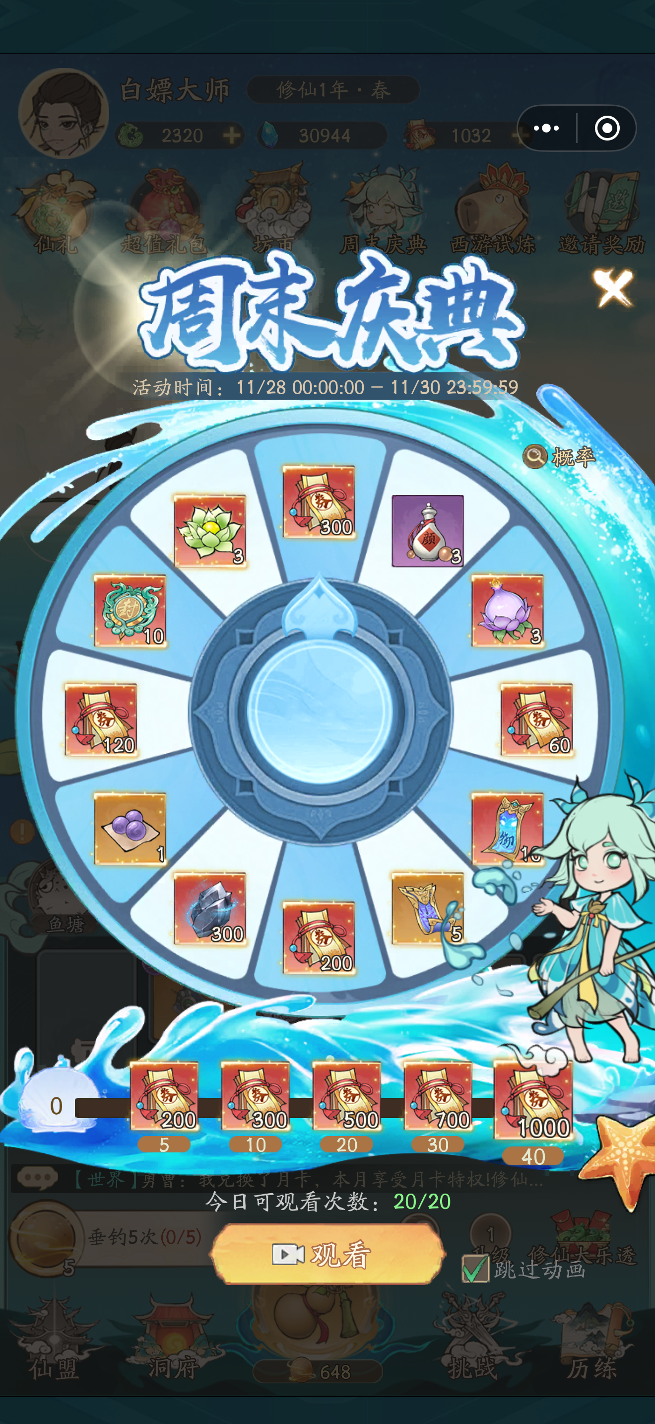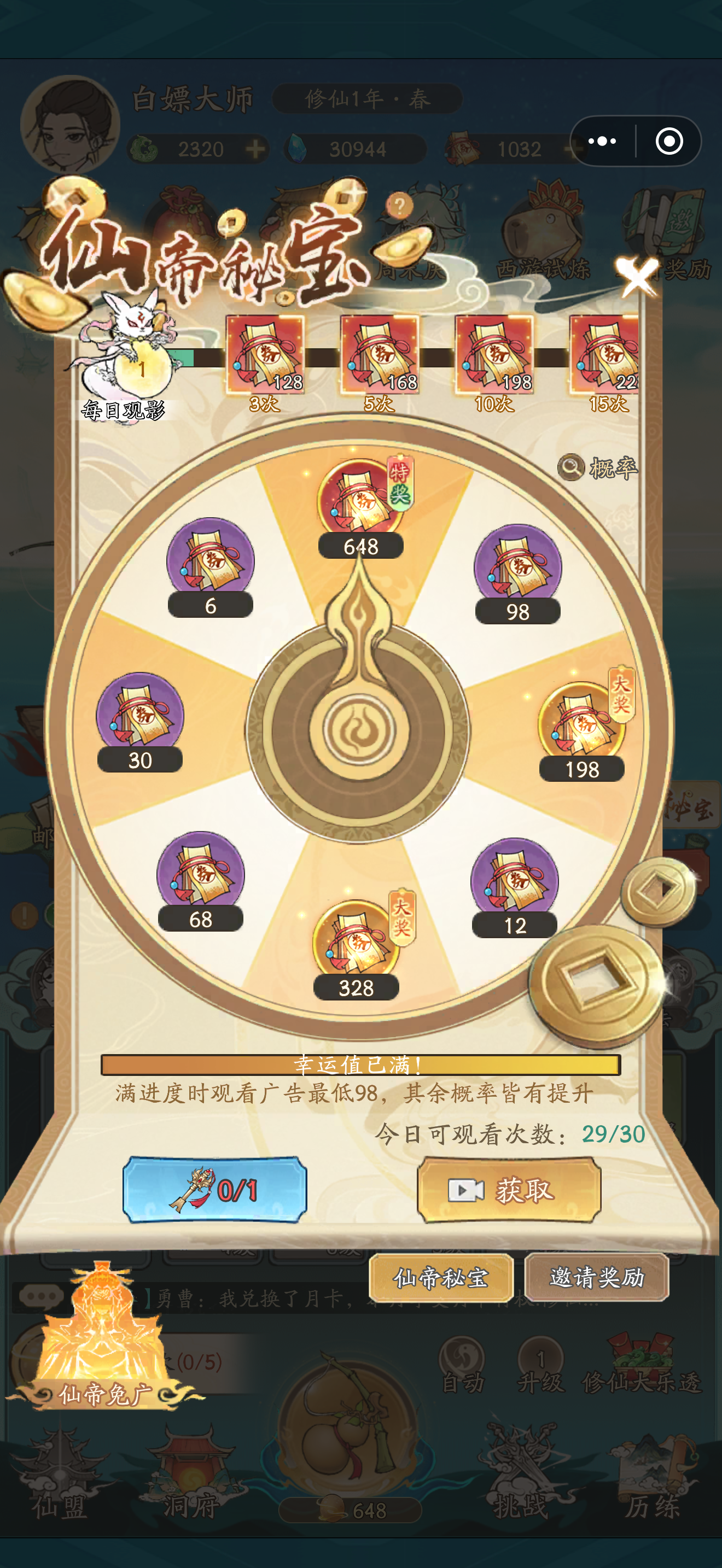 此攻略写给刚玩《我独钓万古》游戏新手玩家,高玩可直接忽略,不喜勿喷,你说的对。 每天看30次广告可免费抽奖30次,记录1000次抽奖得出,平均每一次抽奖可以获得90 点卷,所以平均下来一天的点卷纯看广告获得大概是7500(可能会少的一天,但也会有多的 所有玩家,每天必买: 修仙之路:18+68 礼包 自选礼包按这样每天拉满6+12+18+30+128+198 坊市:玄轮+功法密卷+精铁