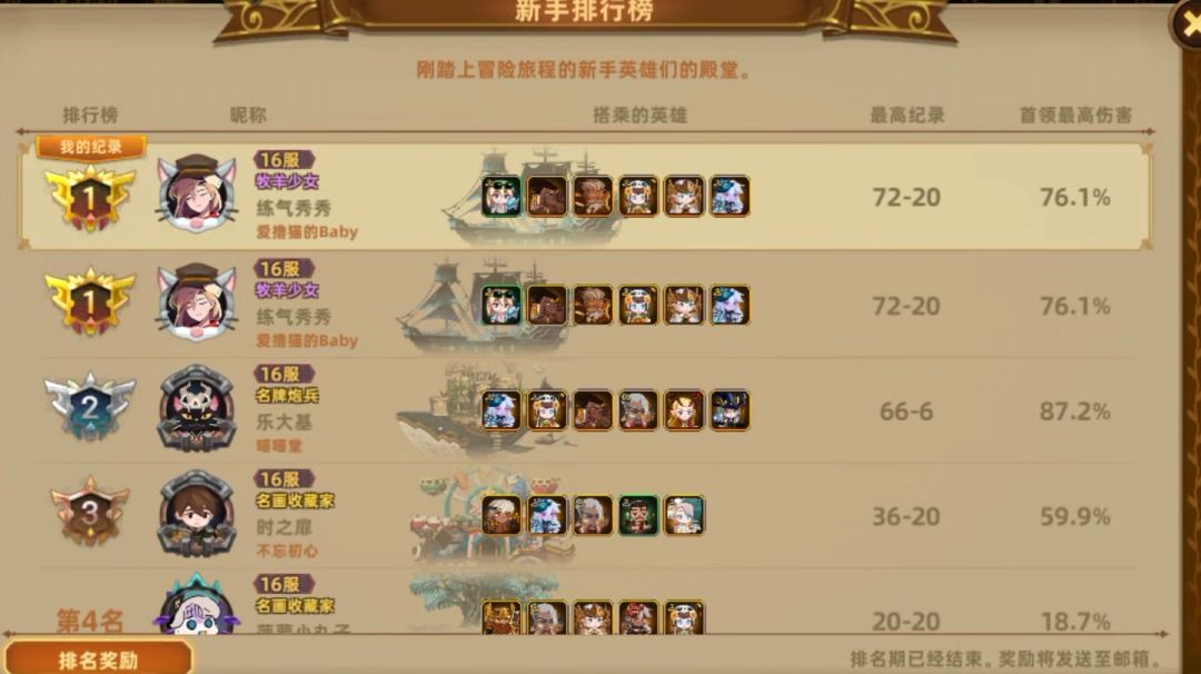 这是一篇简单的总结,没玩过国际服,算是萌新。以下仅为个人主观意见,请多多包涵。 先上图,这是1区总榜排名,平民微氪在开服7天极限推关到19图,推图不卷的话,压力不是很大。 萌新开服进游戏会进一个新手冒险榜,7天排名只有前三有奖励,总榜第三的dalao卷的相爱相杀。 奖励有英雄代币(黄币)可换英雄和限定抽卡道具,所以萌新要是拿不到前三奖励的可以重开了。虽然说多不多,但少拿差距会有。紫币用来换要塞皮肤