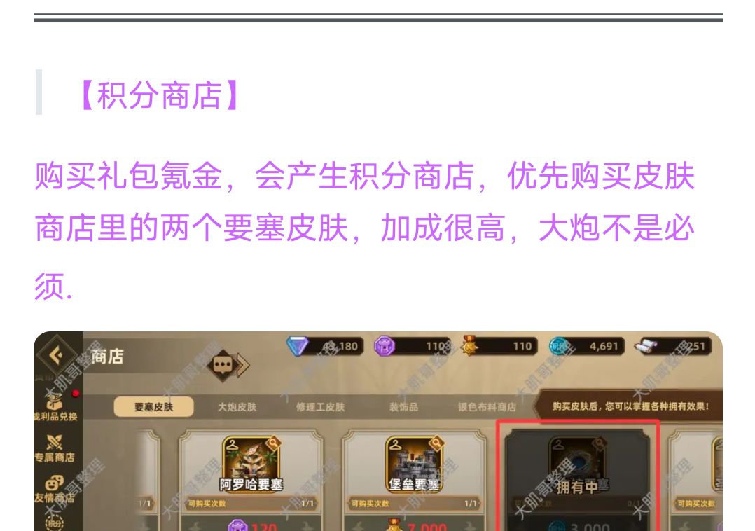 这两个地方是不对的 蓝色里程币先换两个大炮,要塞皮可算可不算。 紫币皮肤买完两个暴击皮以后,剩下的也是买大炮皮肤。 究其原因,所谓的“皮肤独立乘区”只有攻击防御是。其他的包括爆伤首领技能等全游戏都是一个乘区,效果都是相加而非相乘的。 新人注意甄别