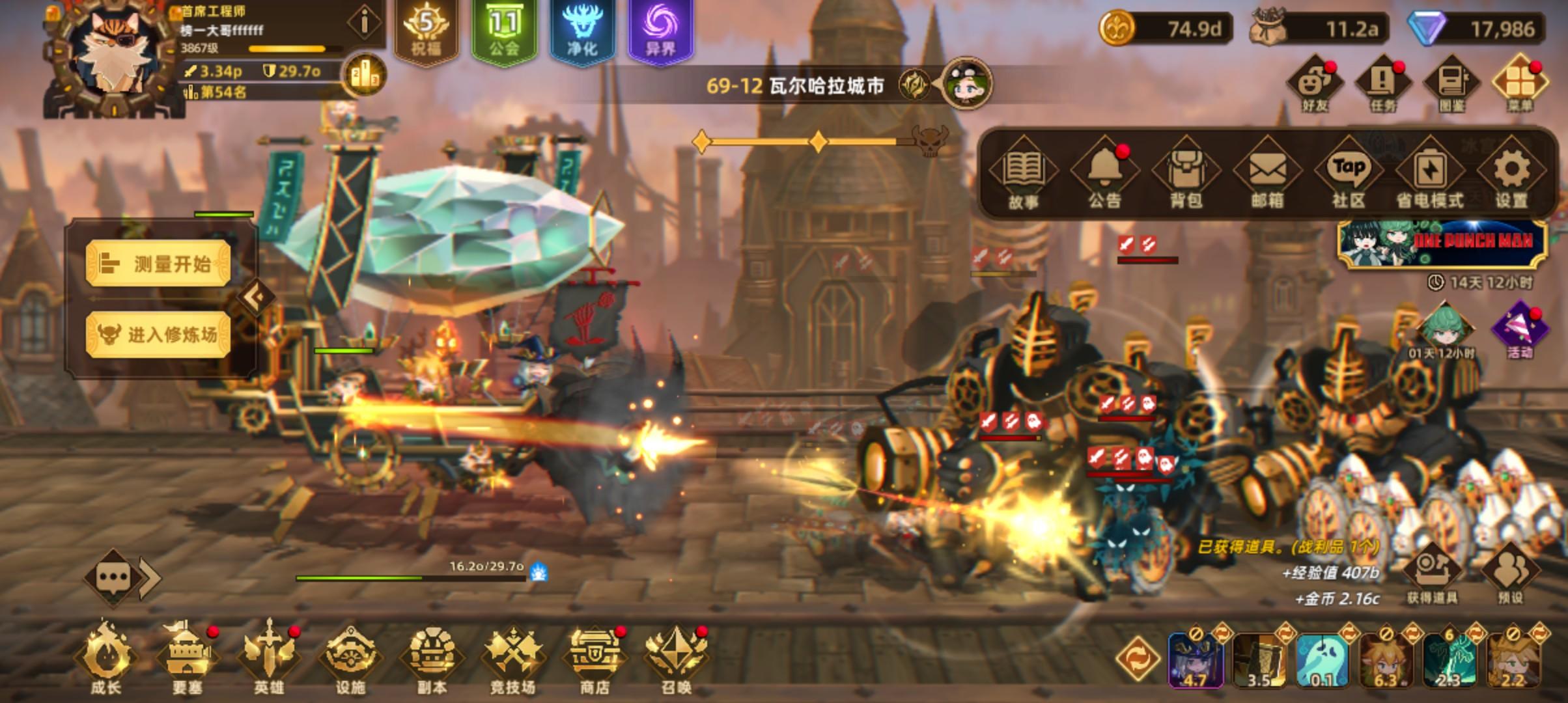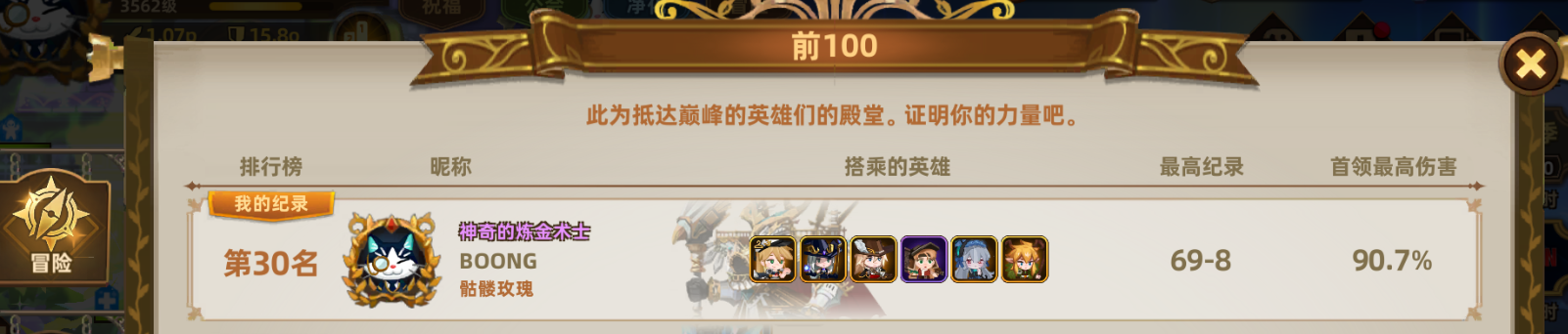 有没有两个号凑齐一个卡册的先例啊。小号今天刚过7天,运气还不错,虽然没抽到爱丽丝,但歪出了一星的天和瓦伦塔恩两个被动是独立乘区的英雄,配合吉童,用一拳的杰诺斯一路秒boss秒到了24关,最后新手榜第三。准备用小号实验一下各属性均衡的木桶流,顺便给大号凑卡册😄