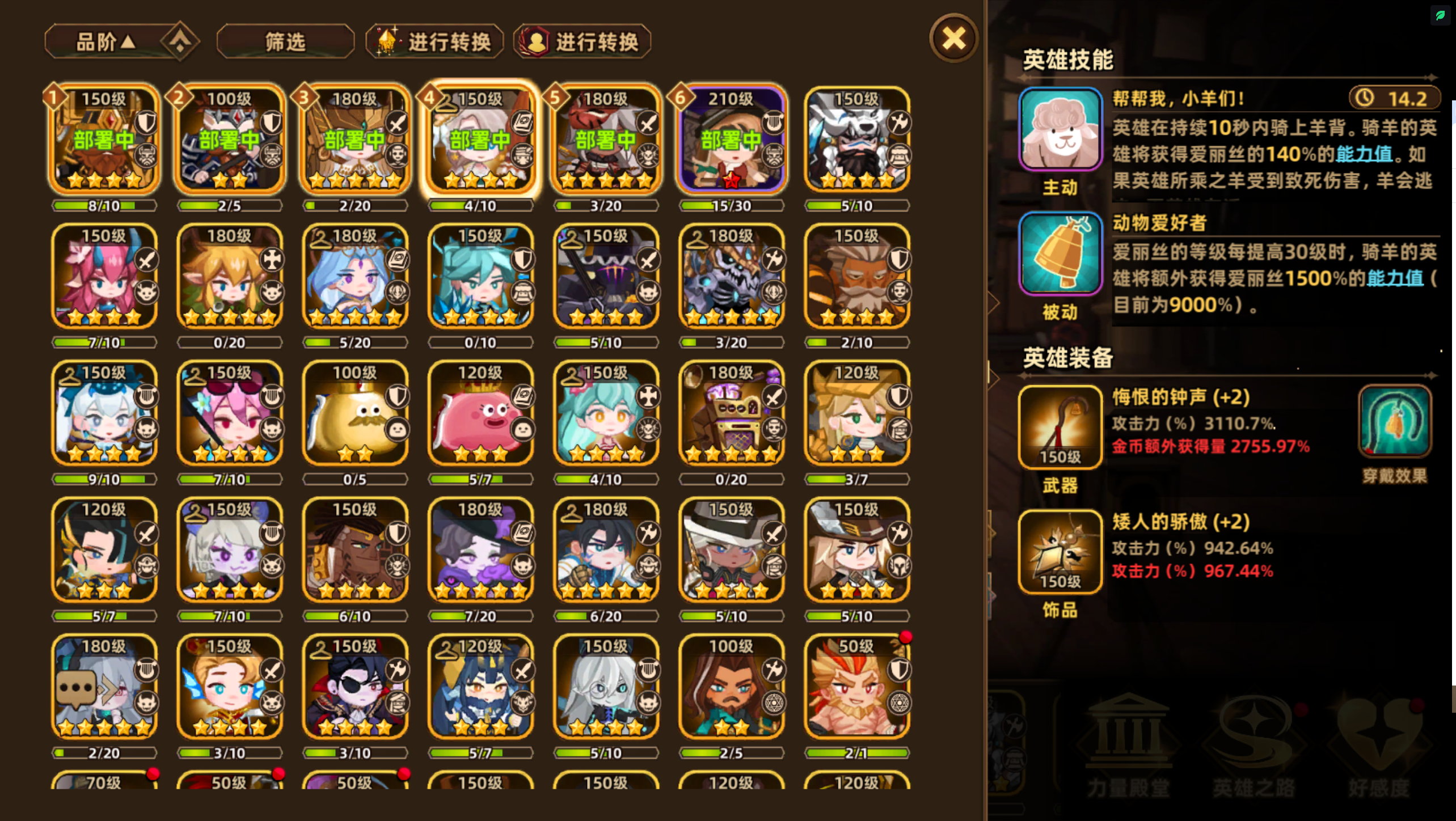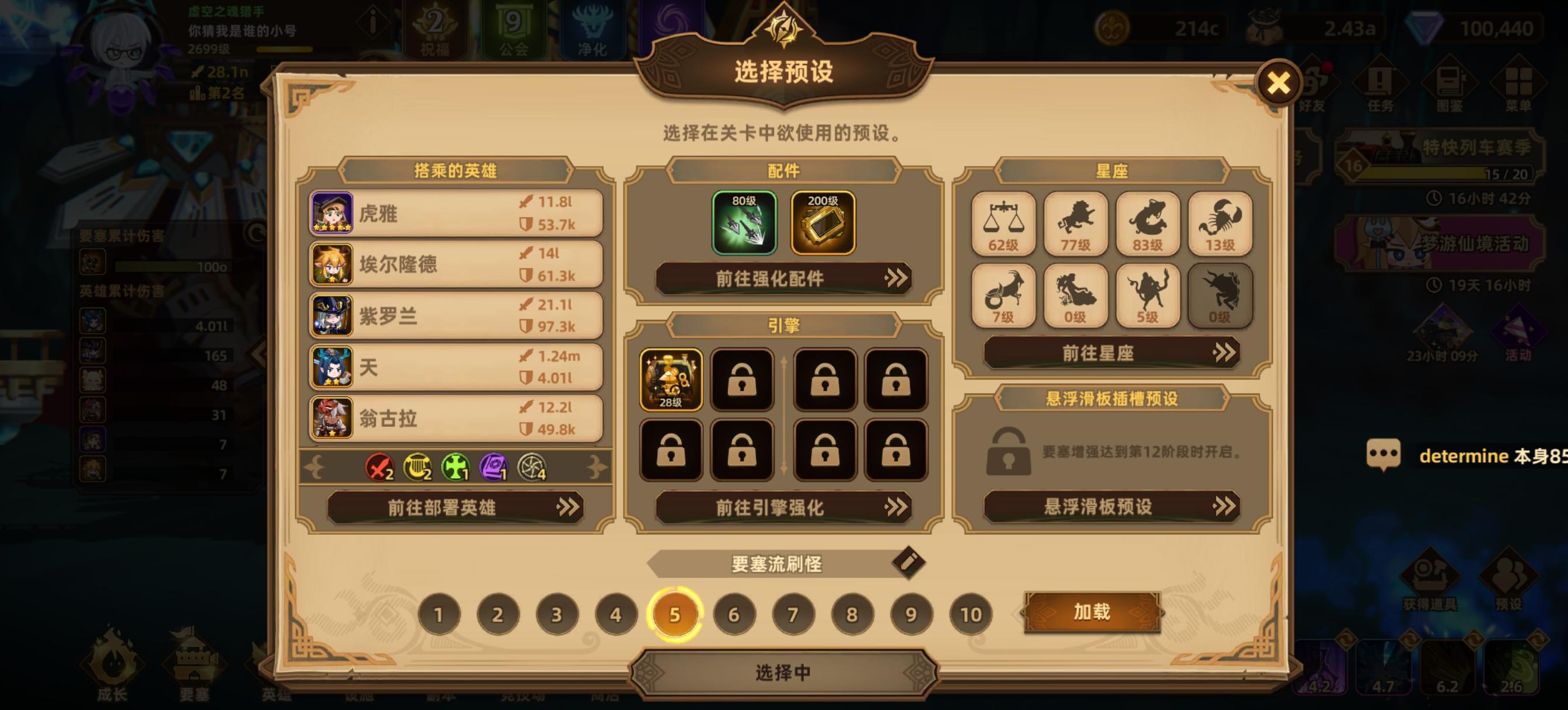 自从要塞流过了100-20之后就转了攻击流,用的是兰花主C的阵容,今天升了几个绿色的五觉英雄之后战力来到了23.5R,在100的修罗场试了几次可以在30秒内打过boss了。不得不说攻击流比要塞流确实繁琐很多,需要提升的地方太多了,而且前期英雄没有五觉的话基本上只能靠装备符文提升,符文的废品率比引擎可高得多了,玩了那么久就一个能用的。我的要塞流是接近1S的战力过的100-20,攻击流20多R就能过,