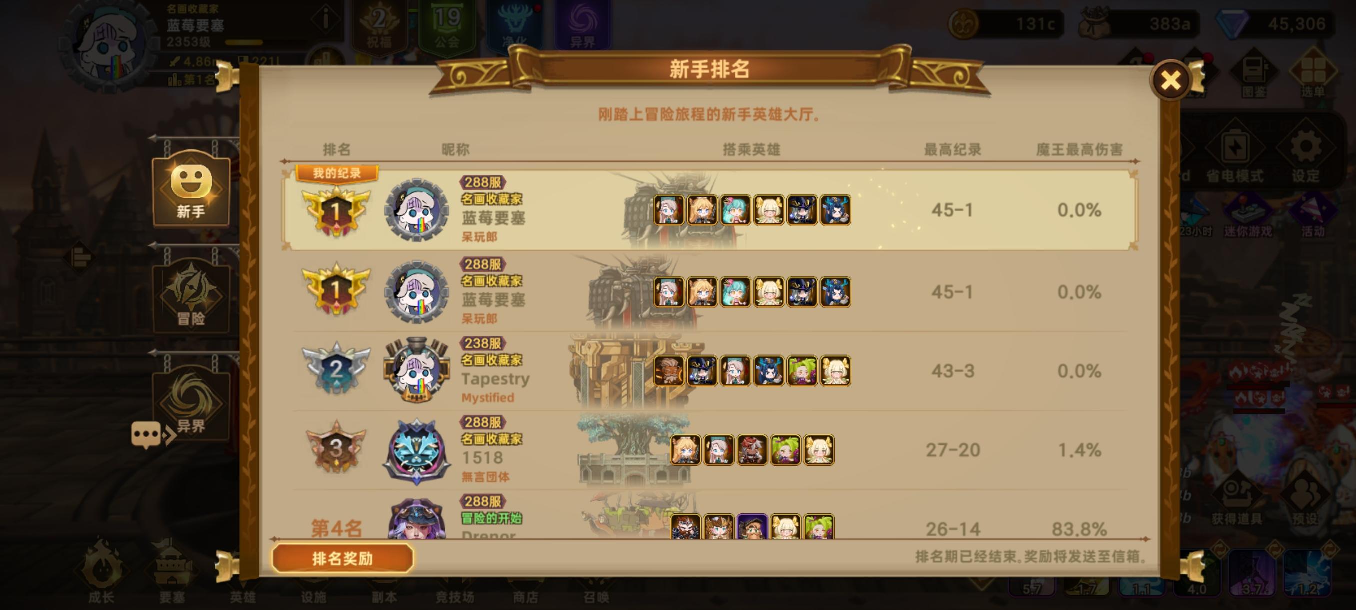 新人第一次玩,第四天才知道有商人这种东西…感谢风啊云啊大佬的攻略,直接照搬输出流走起。道中和boss两套阵容如图(新手期蕾伊真的好用,道中全靠蕾伊和天轮流清怪,用好刷新CD蕾伊可以无限放技能),不过最终还是败给了第一名的氪佬(冲了一个取消等待时间,不算零氪啦)