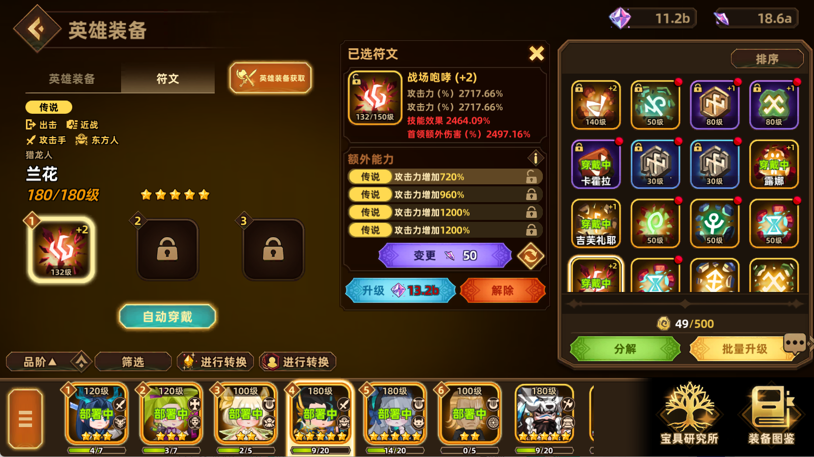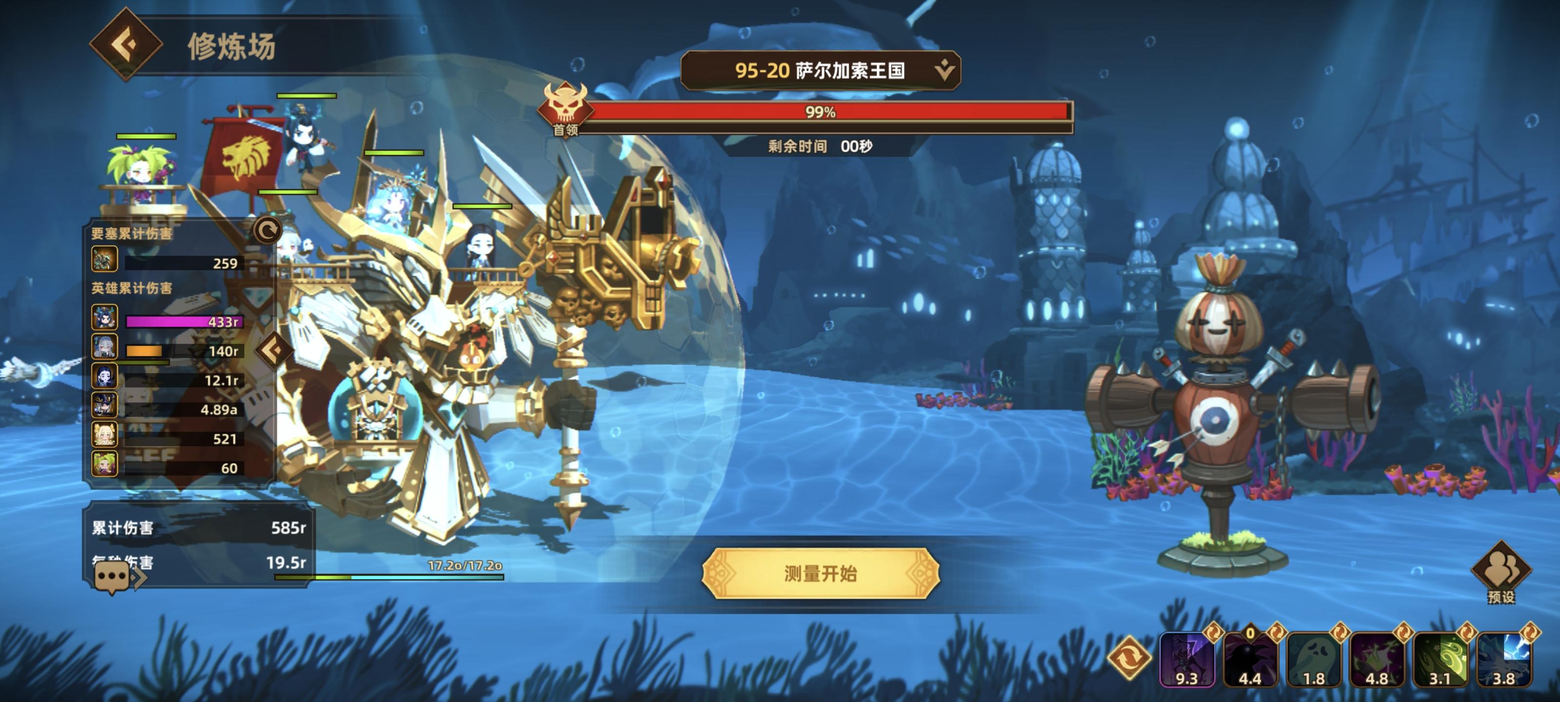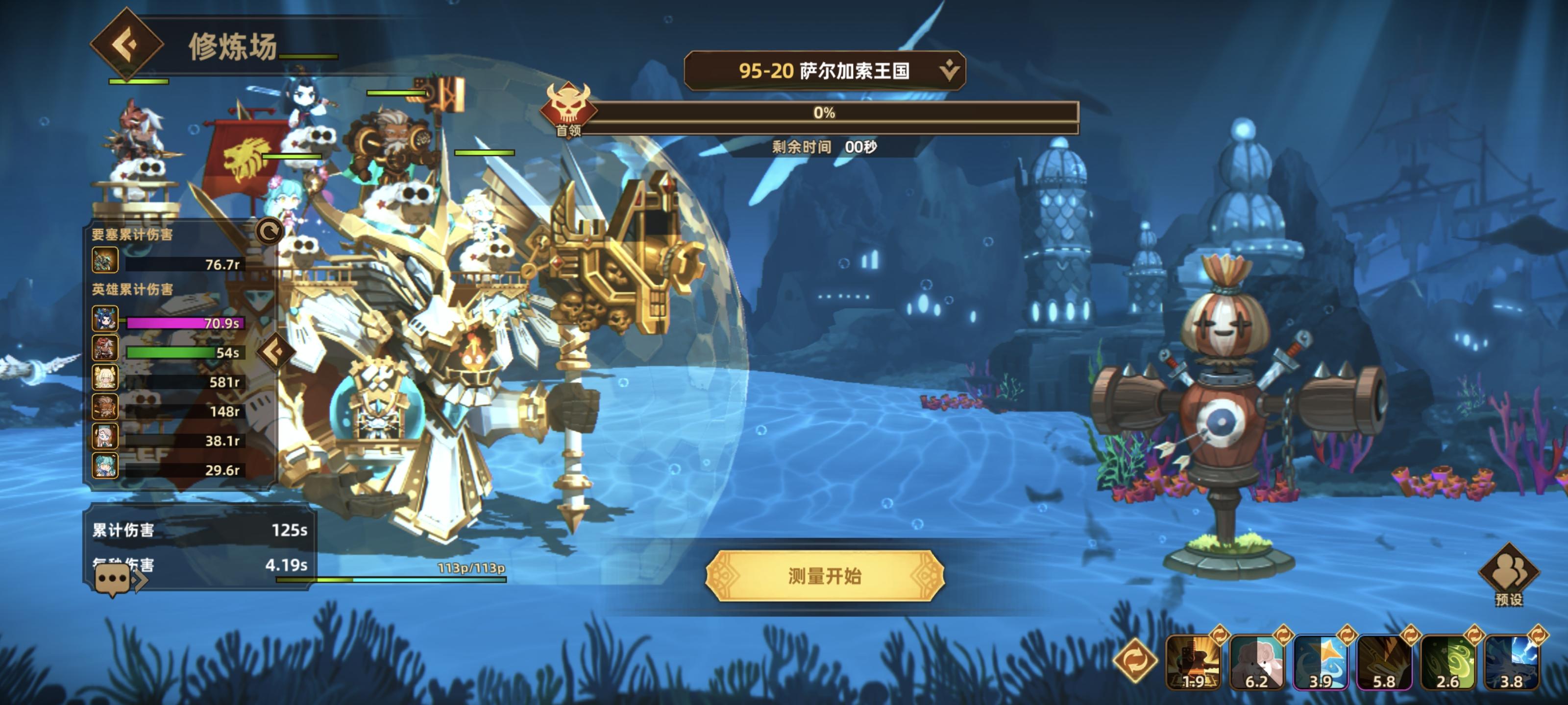 自从要塞流过了100-20之后就转了攻击流,用的是兰花主C的阵容,今天升了几个绿色的五觉英雄之后战力来到了23.5R,在100的修罗场试了几次可以在30秒内打过boss了。不得不说攻击流比要塞流确实繁琐很多,需要提升的地方太多了,而且前期英雄没有五觉的话基本上只能靠装备符文提升,符文的废品率比引擎可高得多了,玩了那么久就一个能用的。我的要塞流是接近1S的战力过的100-20,攻击流20多R就能过,