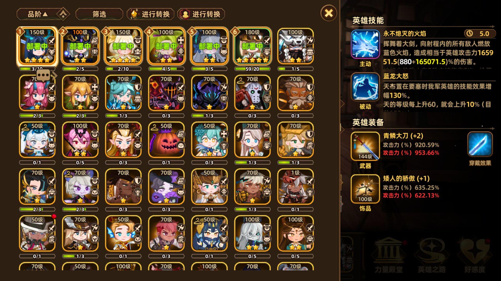 自从要塞流过了100-20之后就转了攻击流,用的是兰花主C的阵容,今天升了几个绿色的五觉英雄之后战力来到了23.5R,在100的修罗场试了几次可以在30秒内打过boss了。不得不说攻击流比要塞流确实繁琐很多,需要提升的地方太多了,而且前期英雄没有五觉的话基本上只能靠装备符文提升,符文的废品率比引擎可高得多了,玩了那么久就一个能用的。我的要塞流是接近1S的战力过的100-20,攻击流20多R就能过,