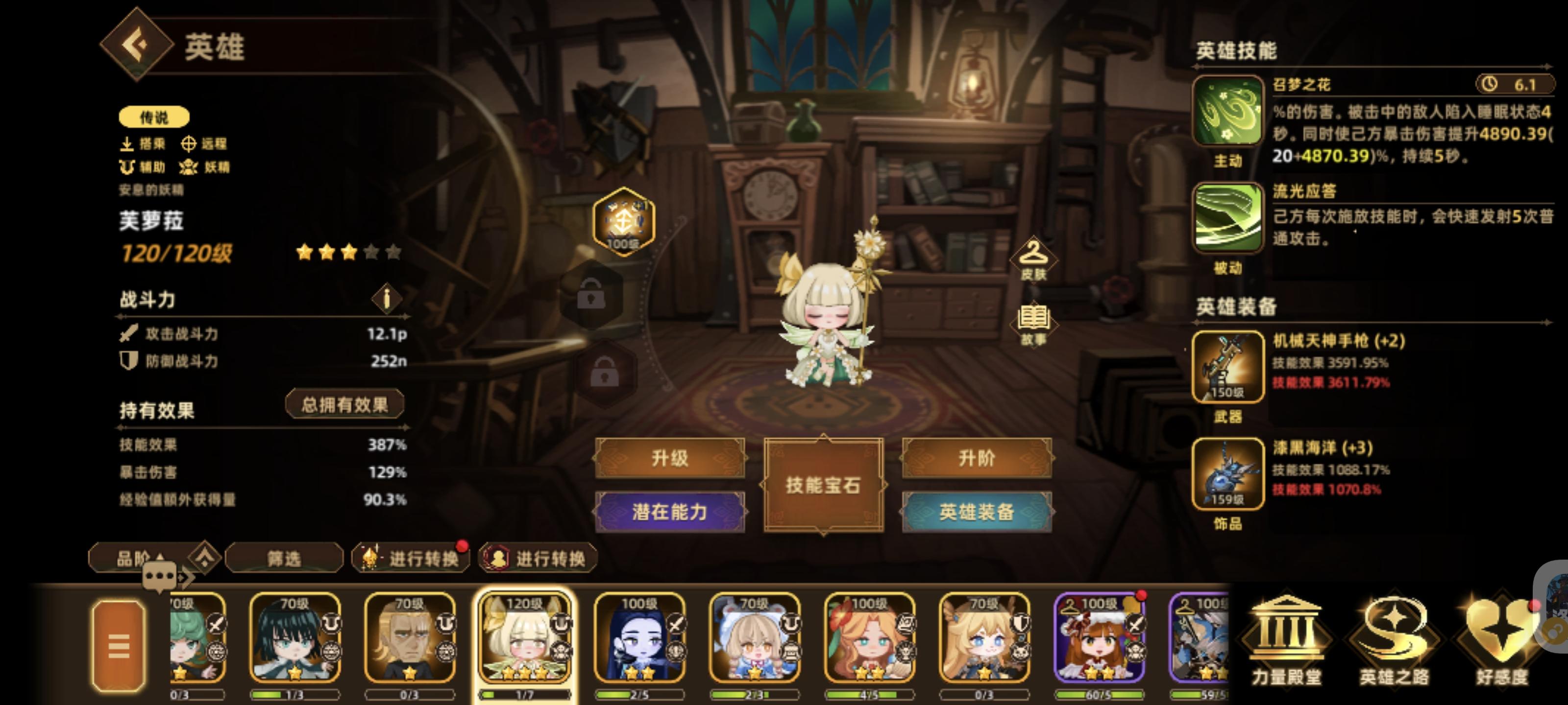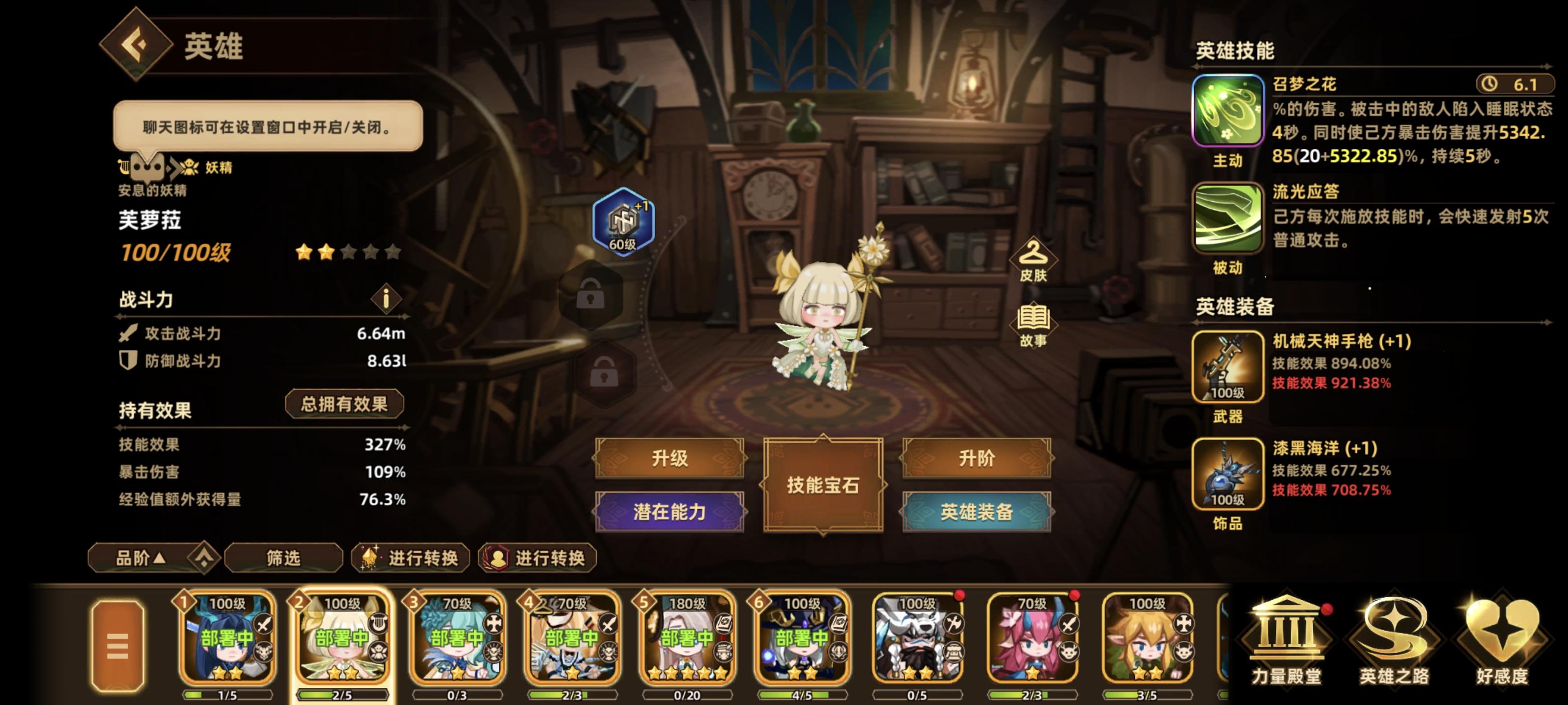 自从要塞流过了100-20之后就转了攻击流,用的是兰花主C的阵容,今天升了几个绿色的五觉英雄之后战力来到了23.5R,在100的修罗场试了几次可以在30秒内打过boss了。不得不说攻击流比要塞流确实繁琐很多,需要提升的地方太多了,而且前期英雄没有五觉的话基本上只能靠装备符文提升,符文的废品率比引擎可高得多了,玩了那么久就一个能用的。我的要塞流是接近1S的战力过的100-20,攻击流20多R就能过,