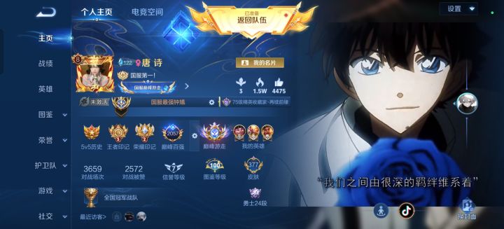 从小学六年级那个暑假开始,断断续续的,我也玩了很长时间了。从第1个本命扁鹊,到一路上分的虞姬。每一个英雄的积攒我都记得清清楚楚,每一场和朋友的开黑我都会激动好久。小时候的我也不知道有排位赛,随便拿个什么英雄,随便开始打就不好了,超傻超开心。慢慢,上了初中以后发现自己的段位是最低的。心里不服气,也只能暗暗较劲。终于到初三快毕业的时候我可以凭自己的能力上钻石了。进游戏的时候我头上显示的“荣耀4年玩家”也让我挺骄傲的。
