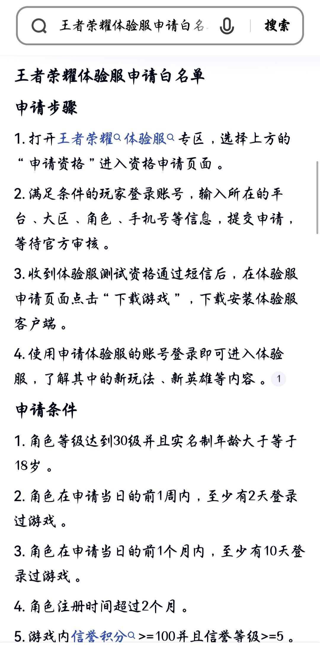 #王者荣耀体验服白名单 去微信找到腾讯客服,发送:体验服 会有链接,进去填信息就可以直接拿到名额了,信誉分要满分