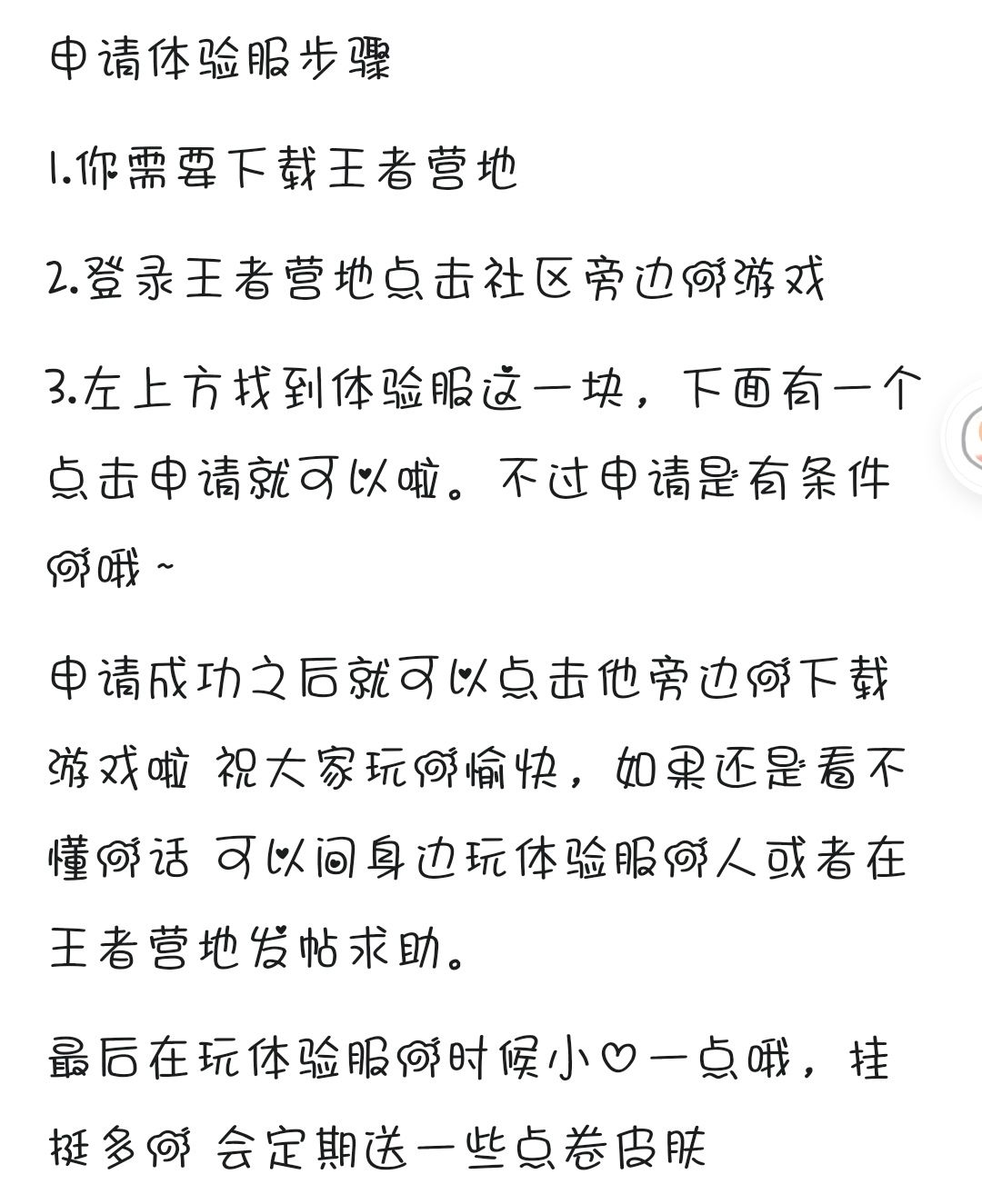 图1我们随便打开一款浏览器,进入到王者荣耀的官网。请确保进入的是官方网站。 图2进去以后它会呈现一个这样的界面,我们再右边可以看到体验服三个字,点击进去会呈现出图3的画面 图3我们点击申请资格,正确填写我们的游戏区号,提交申请,等待通知 图4点击下载游戏。底下会有一个400多mb的安装包,安装好以后,然后更新资源就可以正常玩了#游戏种草计划#攻略#游戏福利#游戏资讯