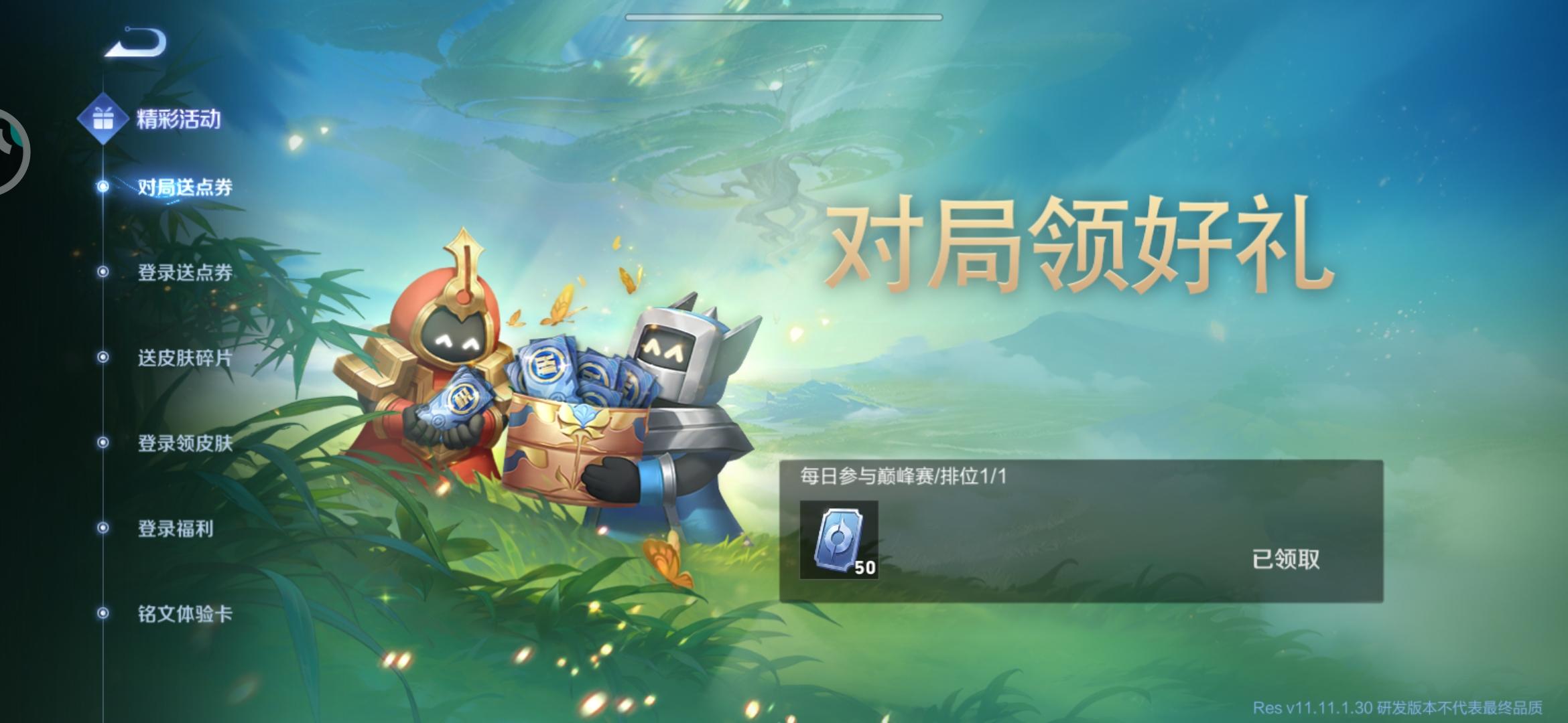 这王者体验服确实有点意思,刚登陆就是新手教程,不过可以跳过后面的话。跳过之后就可以领一大堆的点券和皮肤,我个人来说的话还挺好,毕竟不用在正式服上为了抽奖充那么多钱,200暴击夺宝代金券已经可以获得一个荣耀典藏了,我就获得了一个诸葛亮的荣耀典藏
