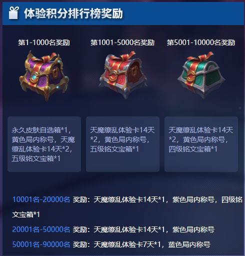 体验服福利放送中,体验服全英雄永久伴生皮肤登录即送,快来领取吧~在体验服你可以率先体验到英雄、峡谷、机制等各类调整,掌握游戏最新动态,同时还可领取海量福利哦~体验服福利一览:1.每赛季赛季体验积分前9万名可分别获得正式服永久史诗皮肤、专属局内称号、限定皮肤体验卡、铭文宝箱等各种豪礼,都为正式服奖励哦;2.体验服对局获得的体验币可兑换各种正式服奖励;3.还有各种皮肤体验卡不定期放送。体验