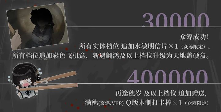 大家好!这里是零创游戏。我们根据喜欢满穗的玩家们普遍反映的意见,把预售解锁目标塔满穗相关的解锁周边提前了档位,提前到了再逢穗岁档位就能直接解锁。这样做的话,可以让支持“再逢穗岁”档位的玩家可以直接全收集本次预售的满穗相关周边且几乎都是前作人物相关周边,是很好的建议!另外,我们经过讨论,决定给大家增加更好的包装,让大家收到预售回报时会更开心。我们把所有实体档位都升级成了彩色飞机盒。预售开始
