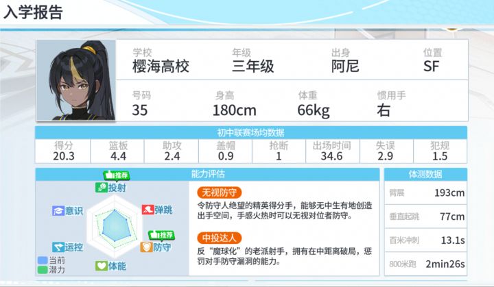 然后分享一下我的主队建队思路好了,由于一测结束后在论坛区看到了角色原型的分析贴,洺瑶就成了我不可或缺主力中锋了,控卫和泉香织、分卫闪堂电、小前锋望月透、大前锋野上泷,凭借闪堂和洺瑶的防守,另外三人的稳定取分,以及三速一全能的加成,再加上洺瑶和望月透无野上泷的羁绊,完全可以以弱胜强,我就是凭借这个组合在战力四万二时通关了速度试炼(由于速度试炼后期需要四个速度球员,因此野上泷被另一个防守型SR速度大前锋替换了),且我的队里仅洺瑶一个SS注册球员(那时我基本上已经放弃玩这个游戏)。