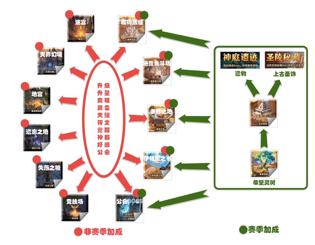 新赛季S1也有一个月了,但一直看到有新区的玩家在达到55级后,对赛季玩法比较懵,赛季怎么玩,与地宫,天界玩法有什么不同,希望灵树点出来的技能效果在天界幻境中是否生效等等问题。本来准备在上篇帖子新手篇后写写其他玩法攻略的,但看到不少人对赛季玩法不太清楚,就提前把赛季玩法先分享下,让大家对赛季有个更快的了解 。 讲赛季玩法前,我们先了解下非赛季。 1 非赛季玩法与非赛季加成 ①非赛季玩法内容 5