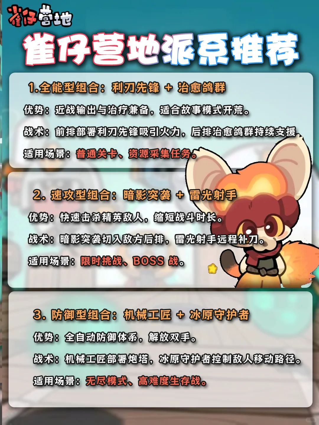 说一下心得: 开图:开图关卡用战争大师,优先升级机枪塔和火塔。这两个升满。其次升级其他的。无尽50波就用战争加鸽子,鸽子选蹦床和音响,这两个也是优先升到8级。加机枪和火塔基本都能打过。没刷出来这几个词条卡就重试继续刷。 无尽刷图以及攻略: 海洋:随便打,找个离洞口第二块比较完整的地块,堵着洞口杀。 沙漠:刷单路线的图。找个离两个洞口第二块比较完整的地块。 雪地:随便打,找个离洞口第二块比较完整的地