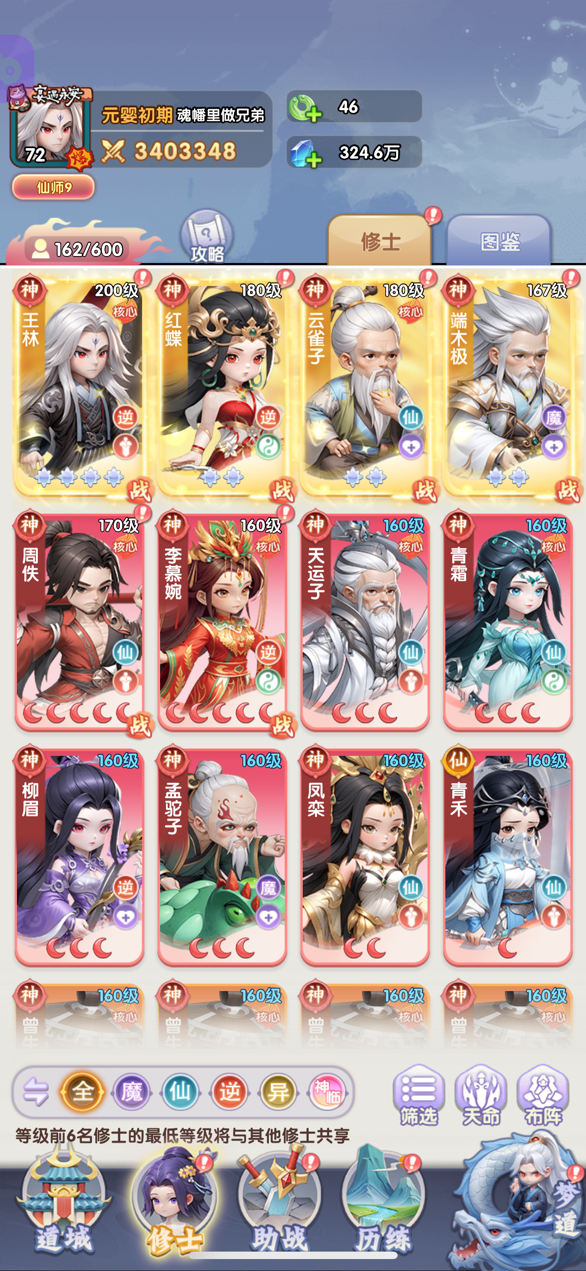 氪老玩家阵容:魔童司徒南、问鼎朱雀子、古神王林、欲印真君、恩师盾天、道心李慕婉(最好仙魂5起步,大概1万5左右拿下)