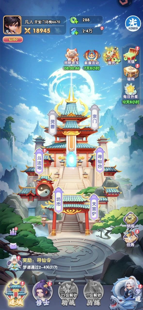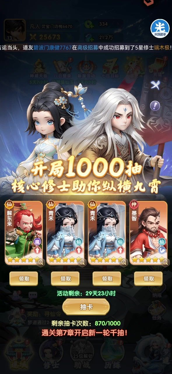 这里教大家快速过图的方法,主要是快速打到4-3可以千抽刷自己要的人物。 进入游戏跟着指引到9级, 9级直接灵石捐献13次,领取经验奖励。 只给黄龙真人升级进阶,11级7天任务给进阶丹。 然后阵容只保留三人,后面3人不要,这样黄龙真人追击一刀一个,几分钟就可以千抽。 马上给大家出刷天运子视频