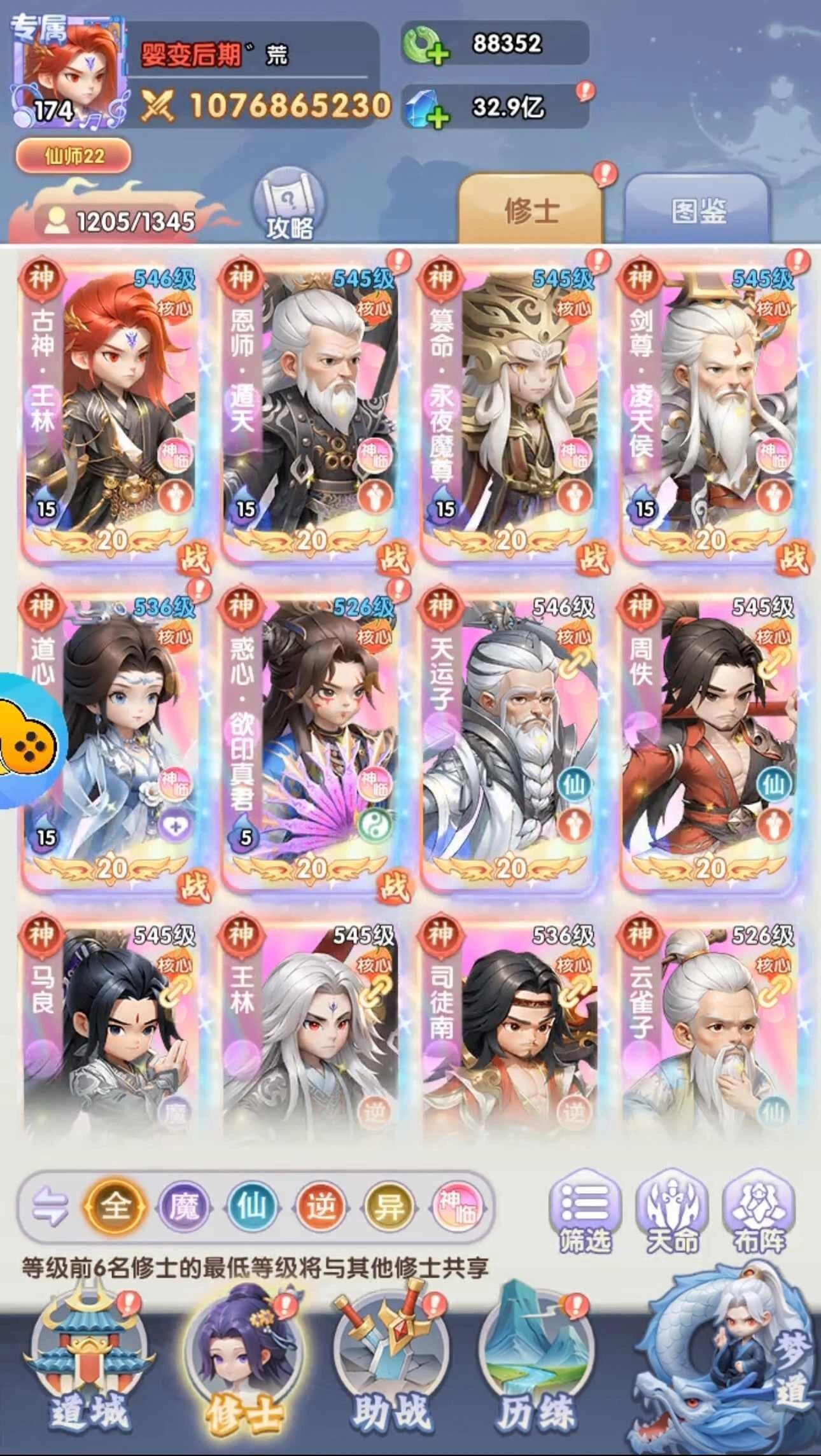 目前修士全部5绿豆以上,零氪资源有限,转追击没有足够的周轶胚子。后期考虑马良+腾一的玩法吧。主双c,传承3个神临过塔用。 #仙逆h5 #仙逆h5攻略 #最强零氪 #1107最强零氪 #1100区以后最强零氪