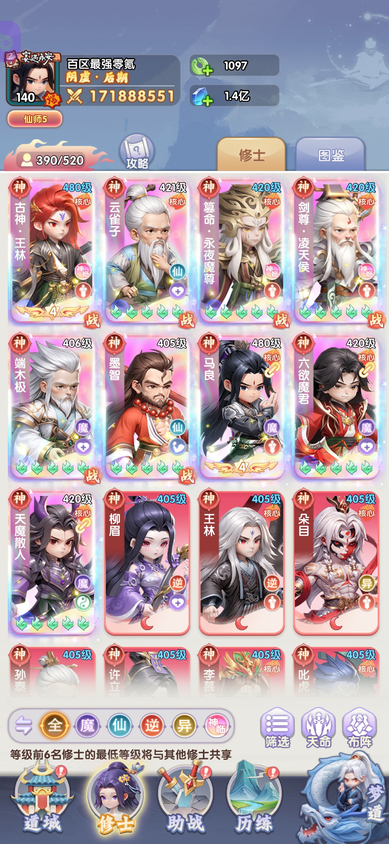 目前修士全部5绿豆以上,零氪资源有限,转追击没有足够的周轶胚子。后期考虑马良+腾一的玩法吧。主双c,传承3个神临过塔用。 #仙逆h5 #仙逆h5攻略 #最强零氪 #1107最强零氪 #1100区以后最强零氪