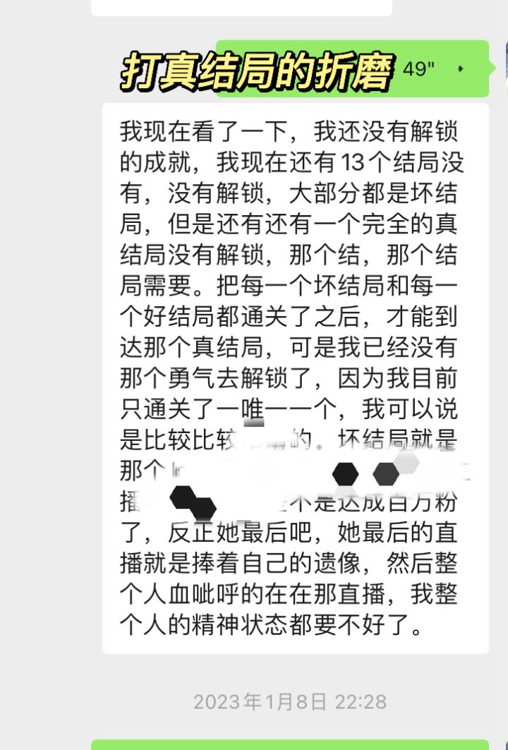 #主播女孩重度依赖 #发现好游戏 《主播女孩重度依赖》“普通人的幸福不是她想要的”结局攻略视频 - 观众注意事项 (16+) 【请所有观众在观看前务必阅读】 本视频为游戏《主播女孩重度依赖》中隐藏结局 “普通人的幸福不是她想要的” 的完整攻略流程剪辑与深度解析。在点击播放前,请您确认并理解以下信 本视频呈现的并非游戏的“主线”或“好结局”,而是一个通过特定、消极选择触发的隐藏结局。 内