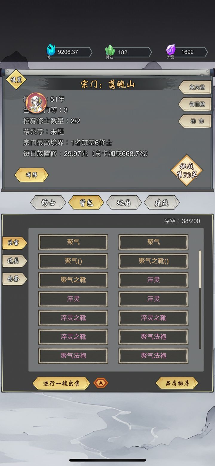 虽然说主要的升级方法是买(用修为换)修士然后滑动升级,但实际玩起来还是没强度的,只要修为够多,修士的强度一会就上来了。