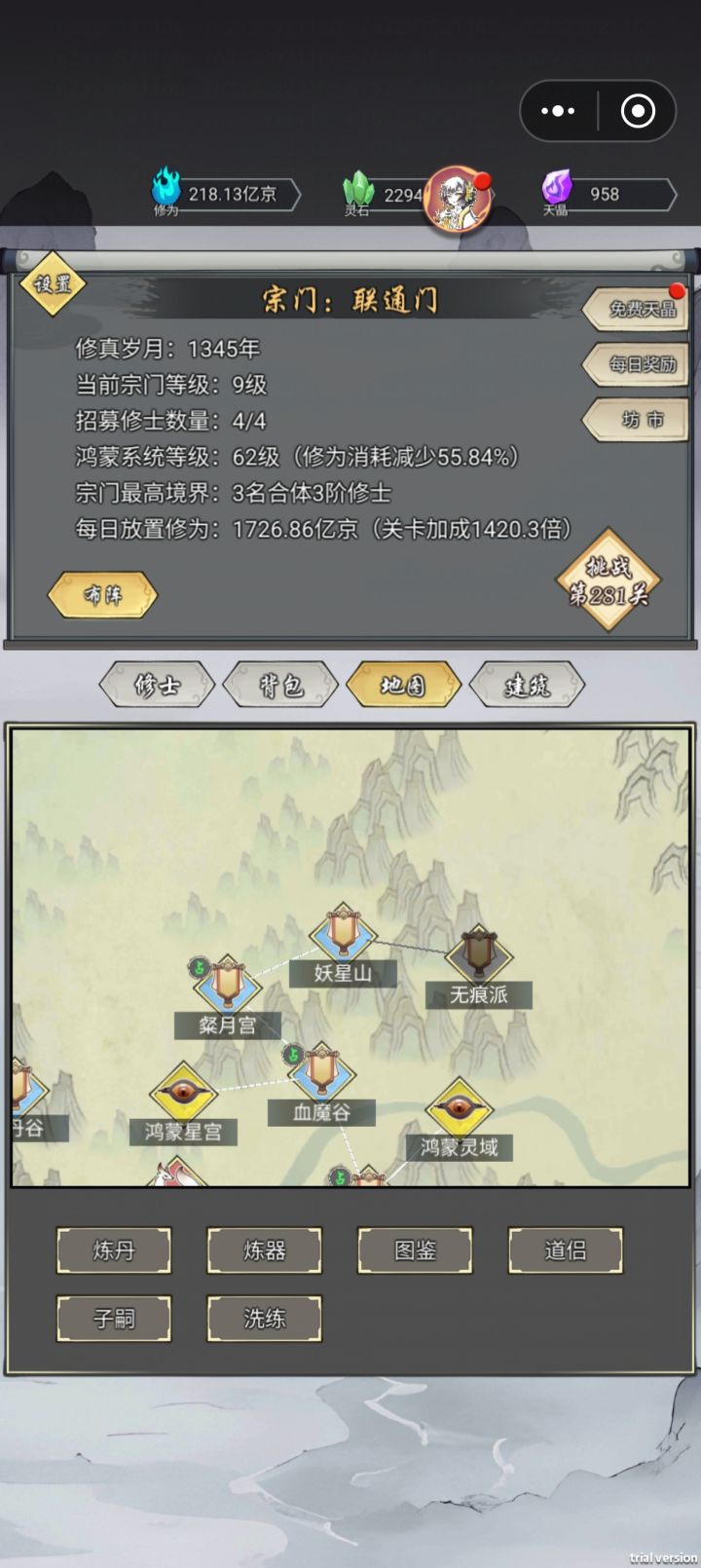 游戏每日5点刷新为新的一天每日广告部分:每日免费天晶2次,修为加速3次(关卡打到上限打不动再看广告)资源产量广告加速3次(建筑,右下角) 成就记得广告领取,前期成就比较多,很多前期资源都靠成就获得。礼包码还有部分灵石和天晶:qq1234、tt666、tt888、tt0603、taptap666、tap123、ys888、ys666、ys777、ys888、qq1234、qq6789、qq6
