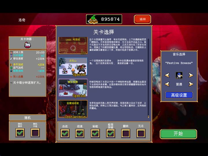现在,叼炸天的武器拿上,神奇的魔法牌开局抽一张,进场就为我们带来一个神奇的效果。如果想挑战自我还可以全程只拿一种武器。在关卡中还能调整各种功能开关,增加游戏难度,加快游戏流速,开启秘能魔法牌,突破武器等级上限,翻转地图难度翻倍,还有开启无尽让我们战至天荒地老!