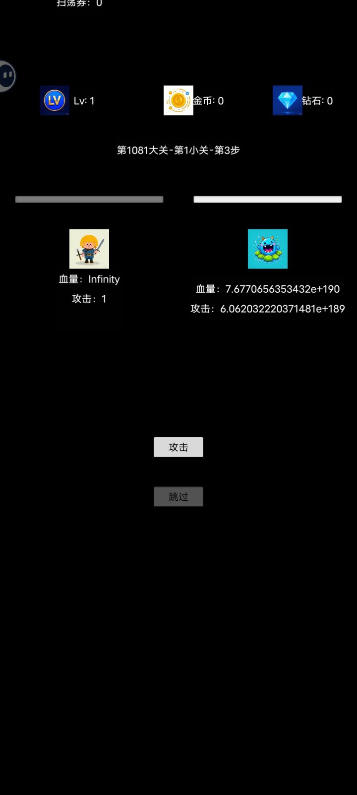 点击操作,以关卡制进行游戏,每一大关有10小关,可以直接下一关到最终关卡,打过即可过关。只要数值够,可以直接打最后一关即可。仅有冒险一种模式,内容量较少。