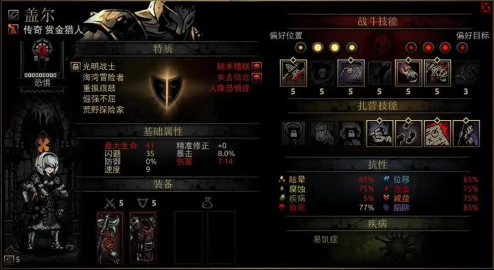 麻风剑客残破其刃,坚毅其心优点:面板数据第一,拥有最厚的血与最高的伤害,能够自保缺点:低到令人发指的精准度,腿短,抗性低,站位要求严苛,惧怕乱位(光这一点就让麻风成为了无光下的下水道人员)技能解析:12技能即平砍,不多做介绍,3技能能在击退敌人的同时给自身增加精准,但在实战中难以腾出回合使用,故实战用处不大。4技能以增加自己所受伤害为代价来增强自己的伤害与精准,打boss带一个总没错。5技