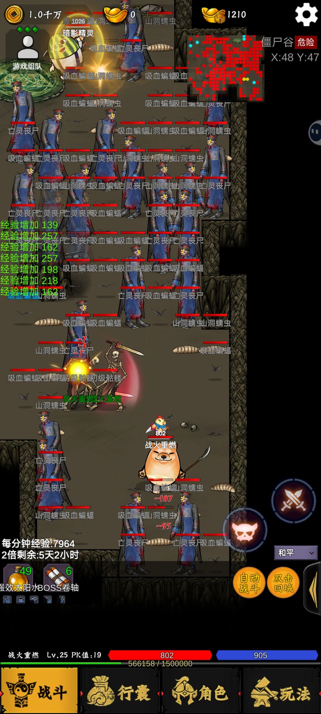 进入游戏 使用双倍经验 马上点练功 天赋点领悟5级优先满 直接杀鸡 8级开危险地图去危险图杀鸡 直到杀够1万只 肝帝开地图抢boss到18级学玩骷髅后去杀鸡大概3小时杀完 杀boss的勋章不要回收可以合成 留红色的一个个等级合上去放图鉴 杀完鸡去危险兽人升级到23级学抱月后去僵尸洞 玩带技能抱月 偷杀 +3个盾 25级带上跃马幸运上9+本身1点10点去开图开毒蛇谷 前期练级地点 鸡场到杀完鸡 兽