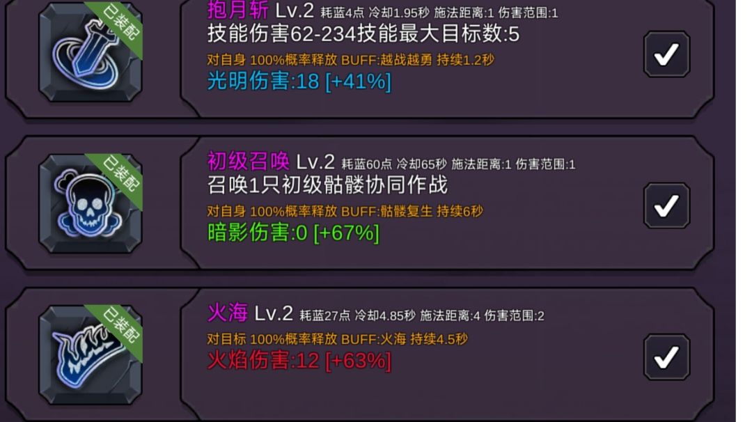 护盾增加伤害,受灼烧目标伤害增加,亲测效果杠杠的,,新手玩法,刚开区吃完双倍经验,在吃一个双倍爆率,砍鸡到9级换图,第二个图手动找白名,黄名怪打,勋章可以合成尽量留红色的合成后当然收集增加属性,能打低三个图了感觉换按前面的继续找怪,写的不好请大佬支出