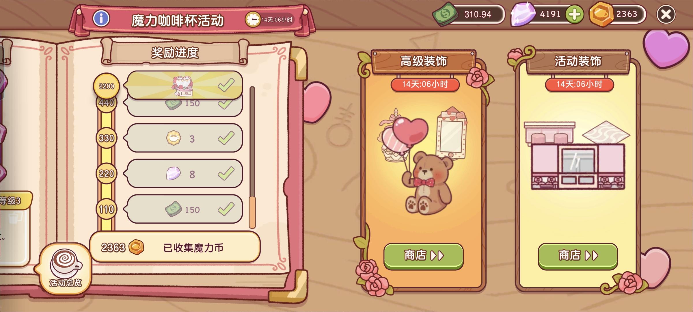 有一个咖啡预言家,把他的小茶杯托付在你这了,为期14天,他需要处理一些事情(故事)每天都会有免费的转第一张图大咖啡杯的次数,可以用来加点,这第一张图右边三个技能(加点后技能更加强力,获取的活动硬币也会越多,)(一个技能最多升三级)第一个技能,冷却100秒,点击局内的咖啡杯,掉落的爱心收集起来,会增加当前顾客的好感度,外加上可以赚取活动硬币(4/5/6爱心)第二个技能就是说可以复制你当前的咖