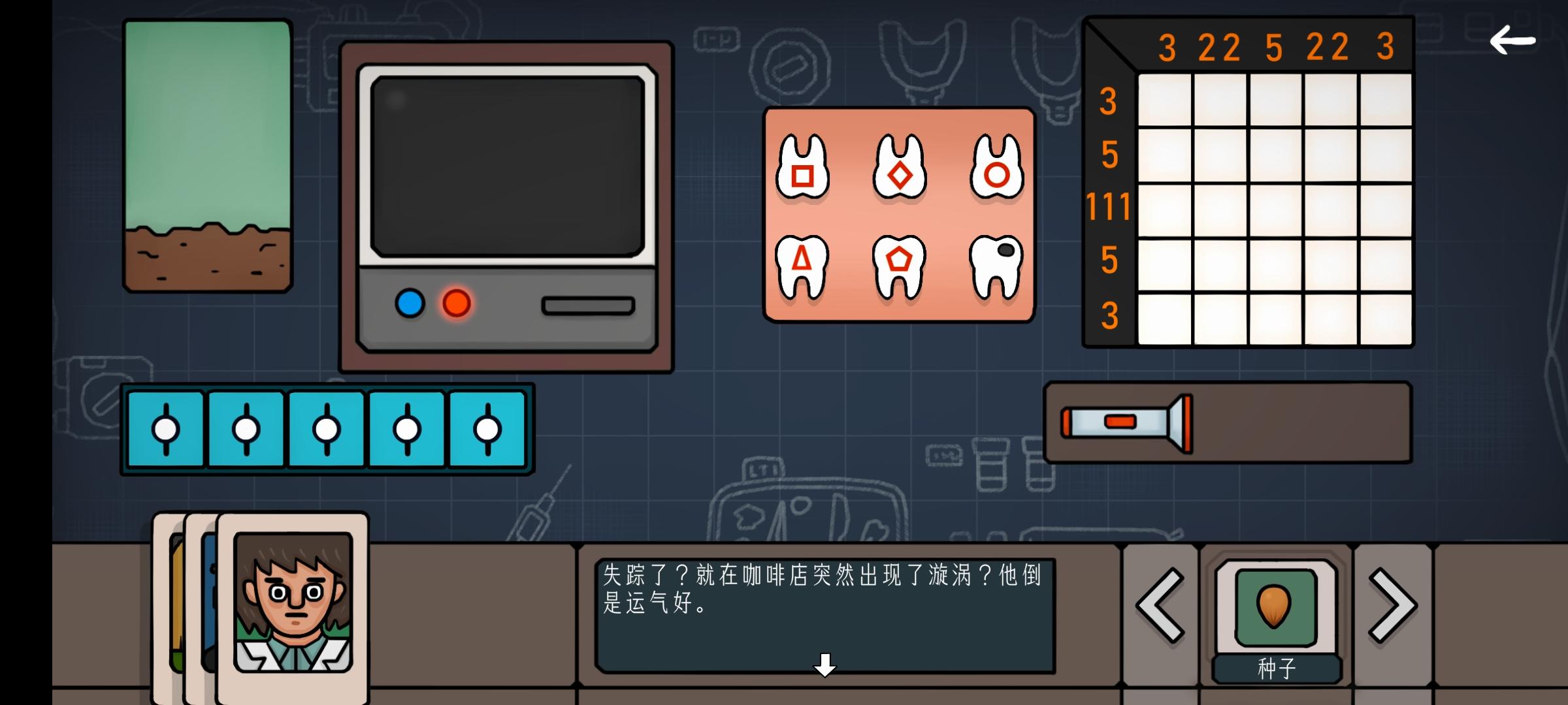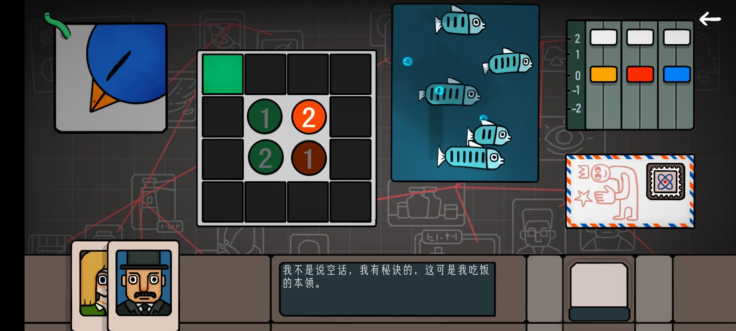 将杀虫剂拾取到物品栏,点击红色笔记本拾取种子和邮票并将邮票并拖到右下角的信封上让数字附近的绿色区块与数字一致。同时注意鱼身上的条纹数量。得到上一幕机关的密码。然后对鸟使用杀虫剂,让它醒来。第三幕右上角数织解答如图所示。在蓝色机关处输入密码34526。种子种土里,将长出的花剪下。花放入第一幕的瓶子里,得到蝴蝶。蝴蝶给鸟,得到羽毛。记住出现的骰子的图案。将右上角机关的解锁方式如图。将宝石