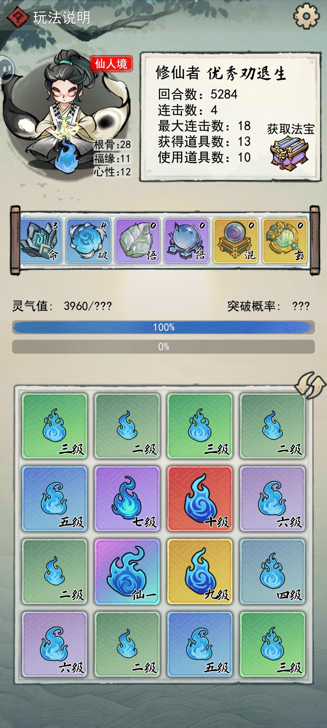 三十分钟第一次玩突破仙人,这游戏本身还是非常简单的,最好是一直来根骨,这根骨一到十三点左右就只会来二级灵气成仙难度瞬间降低了将近三个档次,本来渡劫差点没过去要重开了根骨一提升瞬间突破了本来还想刷一刷有没有4048呢下次在刷吧